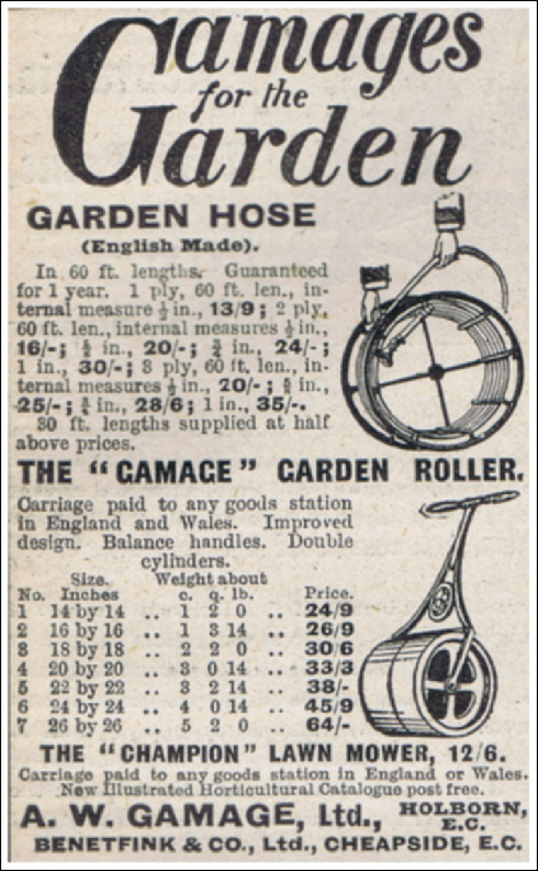 A.W. Gamage LTD of Cheapside, London, supplied a lot of garden sundries. 1910.