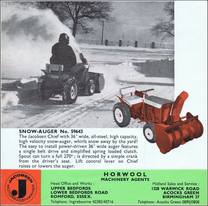 Jacobsen, marketed by Horwool from their Romford and Birmingham offices had the Snow-Auger in their brochure. The Jacobsen tractors appear with snow blades in the UK but has anyone got a Jacobsen Chief with a snow blower as in the image on the right? An image of the Jacobsen with a blade can be seen here in the gallery.