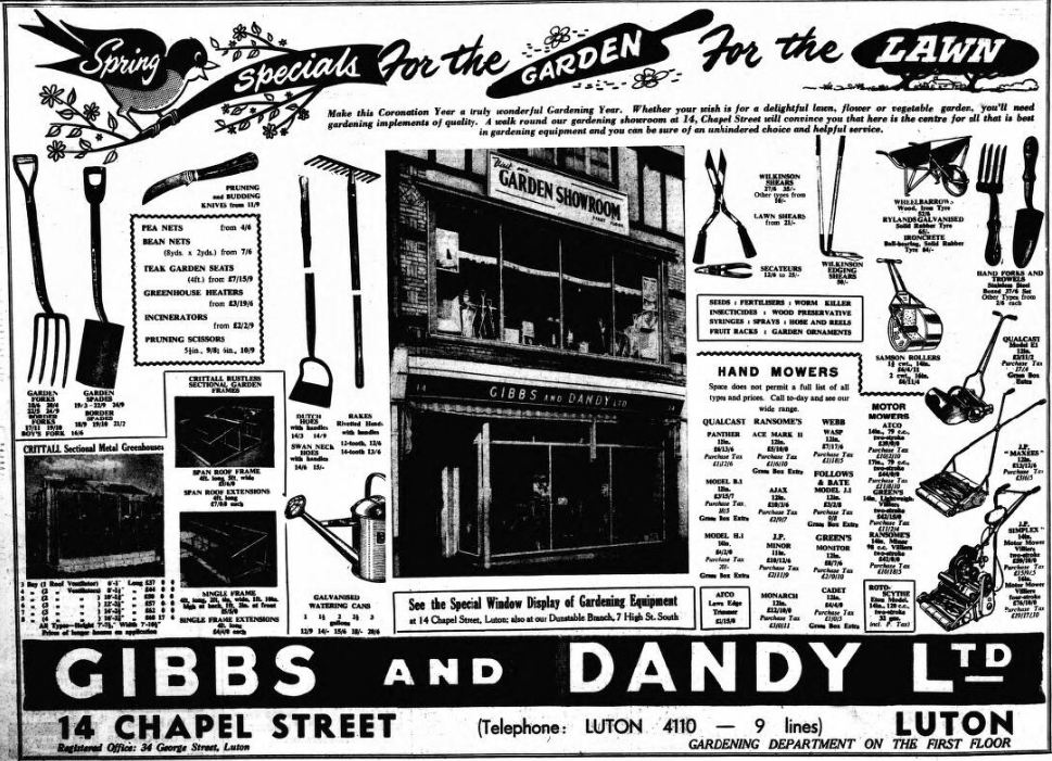 In 1953 an advert (reproduced lower below) invites the customer to ‘See the special Window Display of Gardening Equipment at 14 Chapel Street, Luton (image below) and also at our Dunstable Branch, 7 High St. South (image above)’