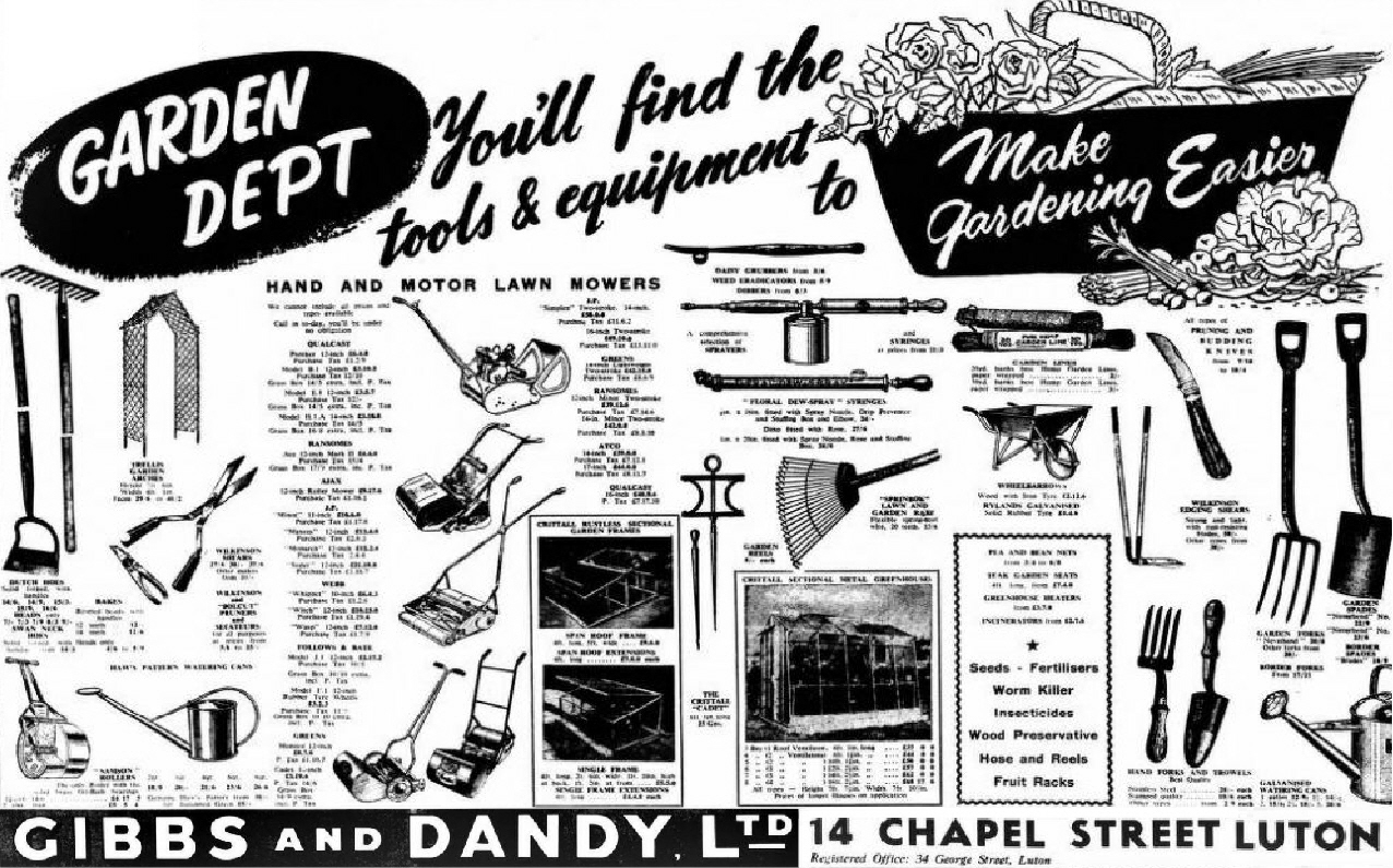 Recently we came across adverts for Gibbs & Dandy LTD who retailed from the Luton area and early adverts indicate they were ironmongers originally. Into the 1950’s their adverts also show gardening equipment, lawn mowers and tools. But Gibbs & Dandy also did some great window displays and with the help of some newspaper research and Mr Google we find a little bit of history, although just as Woolworths and Pick ‘n’ mix expired so did Gibbs and Dandy shops and their displays which must have been enticing at the time.