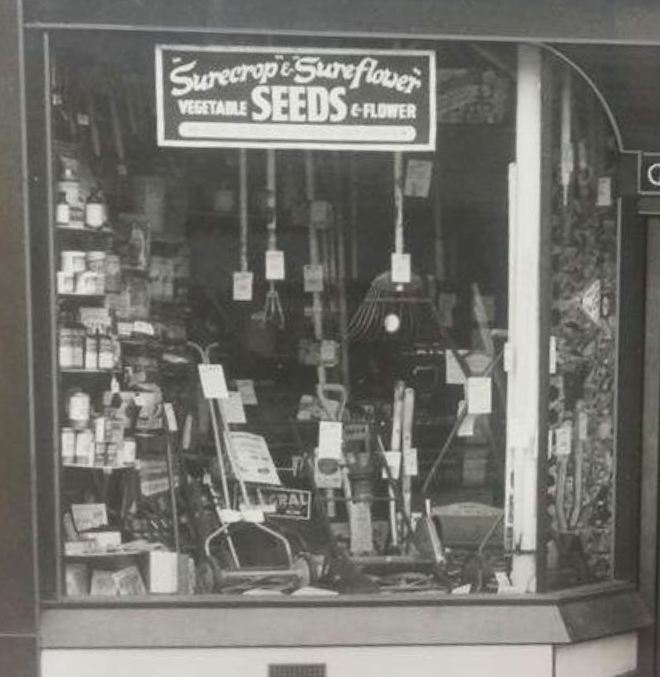 A close up of that shop window (large image below) shows an array of items for sale. It appears to show shelves laden with potions and chemicals on the shelves to the left, the more one looks then the more interesting the image appears. The mower to the left is probably a Qualcast E1 (approx. £3/11/2 at the time) and the mower in the centre possibly a Qualcast Panther, the mower to the right a JP or perhaps a Greens – but it’s open to interpretation. Also visible are spades, rakes and hoes and to the back of the shop appears to be even more tools and items for the dedicated gardener. Don’t forget that the tools would have been bright with new steel and polished wooden handles and the mowers with bright blue or green paintwork, the ‘Surecrop’ seed advert hanging in the window was probably bright yellow and it would all have been a display to draw customers in. We are sure that many people would have stopped for a few minutes and looked at all the sparkling new tools and shiny machines, studying the price labels wondering if they could afford what they wished for.