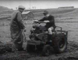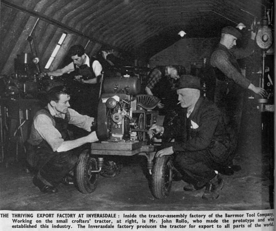 The Inverasdale factory, images below, although just a small operation, was housed in a prefabricated asbestos building on (according to newspapers) an existing concrete base left from wartime activities. The image below from 1955 shows the inside of the factory producing tractors for the Scottish crofters with John Rollo at the front-right on a visit to the factory, this factory not only produced tractors but gave work to local people which is something John Rollo was very keen to do. A 1955 report says that a tractor demonstration (photograph at bottom of page) at Windyedge Farm, Perth, used two tractors one being 3hp and the other 5hp, both made at Inverasdale. The other workers are left to right: Jackie MacLean, Norman McIver, Unknown at back centre, Johnnie MacPherson on the right. This is a fantastic image and probably isn’t too far removed from VHGMC members repairing or restoring machines in their sheds and garages!