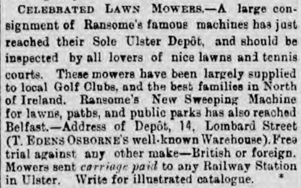 A little more information about Ransomes in Ireland from an 1895 newspaper column (image below) in The Belfast Newsletter reads: “Celebrated Lawn Mowers, – A large consignment of Ransome’s famous machines has just reached their Sole Ulster Depot, and should be inspected by all lovers of nice lawns and tennis courts. These mowers have been largely supplied to local Golf Clubs, and the best families in North of Ireland. Ransome’s New Sweeping Machine for lawns, paths, and the public parks has also reached Belfast. – Address of Depot, 14 Lombard Street (T. EDENS OSBORNE’S well known Warehouse). Free trial against any other make – British or Foreign. Mowers sent carriage paid to any Railway Station in Ulster. Write for illustrated catalogue“.