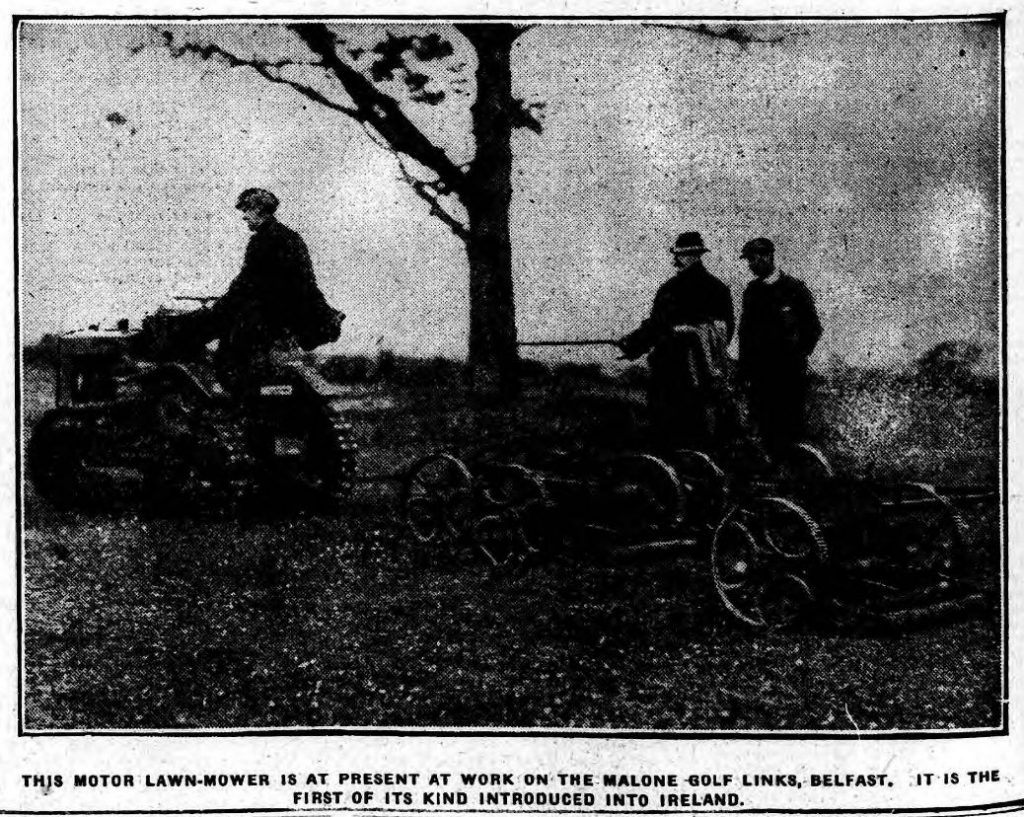 Almost a year later in September 1923 another Irish newspaper printed the following photo shown below with the caption that ‘This motor lawn-mower is at present at work on the Malone Golf Links, Belfast. It is the first of it’s kind introduced into Ireland‘.