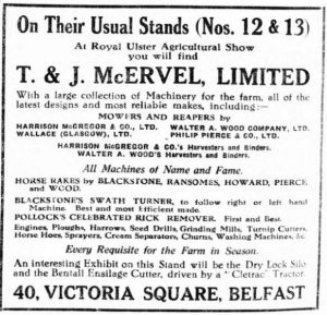 Additionally some text in the 1922 newspaper with the first image tells us about the demonstration of Ransome’s triple mowers at Malone golf links, all arranged by T & J McErvel, Victoria Square, Belfast. Dealers names and addresses are always useful for research.