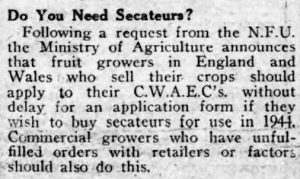The NFU request resulted in county office adverts appearing throughout the country requesting that applicants apply as soon as possible to get their permits to purchase secateurs. We also see a few shop adverts from the same time which were advertising secateurs but state they are either in limited numbers or are ‘available for horticultural trade only‘.