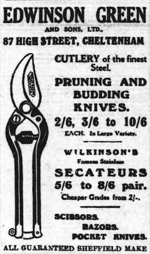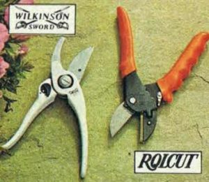 The earliest advert I can find to UK made secateurs is in 1924 for ‘Wilkinson’s Famous Stainless Secateurs‘ which are about the same design as The Secateur Lecointe of 1868 (image further up page). Wilkinson’s tools were all guaranteed Sheffield made and an assumption is that secateurs were being made by others at this time and before as there are earlier adverts which briefly mention the sale of secateurs rather than French secateurs.