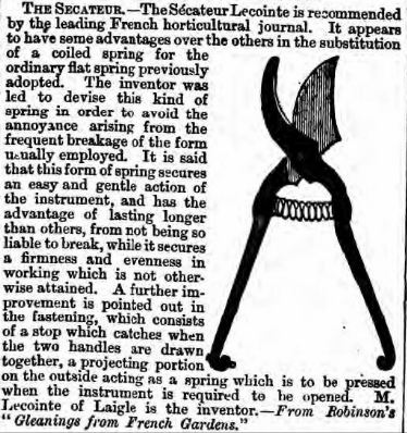 The first UK article I find is in October 1868, the Nottinghamshire Guardian stated that the French horticultural journal ‘Gleanings from French Gardens‘ was recommending ‘The Secateur Lecointe‘, as in the image above right, the secateur had a coiled spring rather than the normal flat spring of previous models and was thought to be superior. I will say that in 2017 some 149 years later and with coil springs on my premium secateurs failing many times that they were wrong, completely wrong, the coiled spring being a backwards step, there I’ve put it in print.