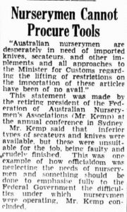 It appears the shortage of steel or quality steel is perhaps why the nurserymen of Australia stated in 1947 (image right) that ‘inferior types of secateurs and knives were available, but these were unsuitable for the job, being faulty and crudely finished‘.