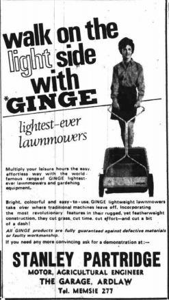 Several adverts for Ginge mowers appear in April 1968 in Scotland. This is hardly surprising since Ginge had a newly set up factory at Irvine Industrial Estate, Irvine, Ayrshire, as well as manufacturing mowers at their factory in Copenhagen. There was also an office at Croxley Green, Herefordshire, although the address appears to be a residential street so presumably an outpost office.