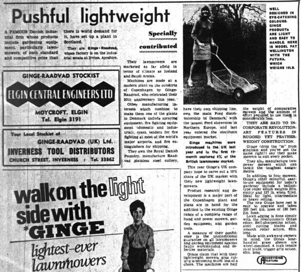 Several adverts for Ginge mowers appear in April 1968 in Scotland. This is hardly surprising since Ginge had a newly set up factory at Irvine Industrial Estate, Irvine, Ayrshire, as well as manufacturing mowers at their factory in Copenhagen. There was also an office at Croxley Green, Herefordshire, although the address appears to be a residential street so presumably an outpost office.