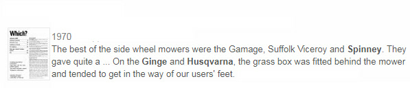 However ambitious Ginge were with their mowers there’s nothing like a bit of comparative testing to spoil the party. Enter one consumer magazine to put the spot light on a range of mowers in 1970. Pitting the Ginge against similar side-wheel cylinder mowers such as one from Gamage, the Suffolk Viceroy MK11, Spinney side wheel mower, Husquvarna from Sweden and the Qualcast B1 was certainly going to cause a squabble on the front lawn. Which was best?