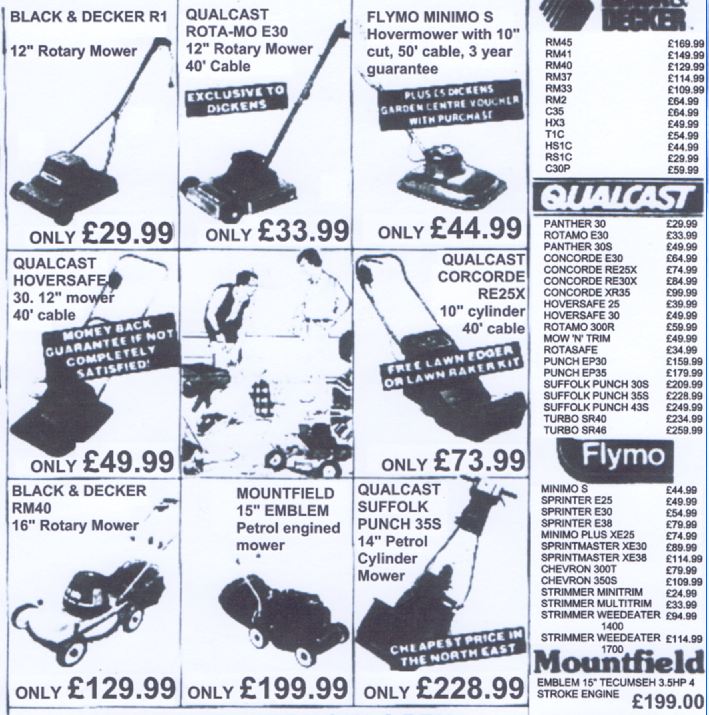 This takes us onto Dickens home improvement stores, they were like an independent B&Q and actually were eventually bought out by B&Q. Dickens advert shown below from April 1988 at the start of the mowing season to attract the spending public shows a vast range of electric and petrol mowers and strimmers too. Who knew there were so many different models on sale at this time? A transcript of this model list and prices will be at the bottom of this article for perusal. Or click this link to see a larger image of the advert.