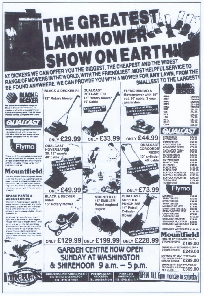 This takes us onto Dickens home improvement stores, they were like an independent B&Q and actually were eventually bought out by B&Q. Dickens advert shown below from April 1988 at the start of the mowing season to attract the spending public shows a vast range of electric and petrol mowers and strimmers too. Who knew there were so many different models on sale at this time? A transcript of this model list and prices will be at the bottom of this article for perusal. Or click this link to see a larger image of the advert.