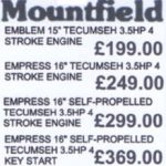 There isn’t a Mountfield electric mower in the bottom right corner of Dickens advert, they may not have been manufacturing them at the time, but their petrol mowers show that the price nearly doubles between the Mountfield Emblem 15″ and the 16″ self propelled with electric start, both with a 3.5hp Tecumseh engine – would that be a premium product at the time? There also happens to be a brilliant Youtube video for a 1976 Dickens television advert. This advert briefly shows machines on display in their garden centre with a tiller, rotavator and mowers at about 50 seconds. https://youtu.be/E3xiHJwIaQ8