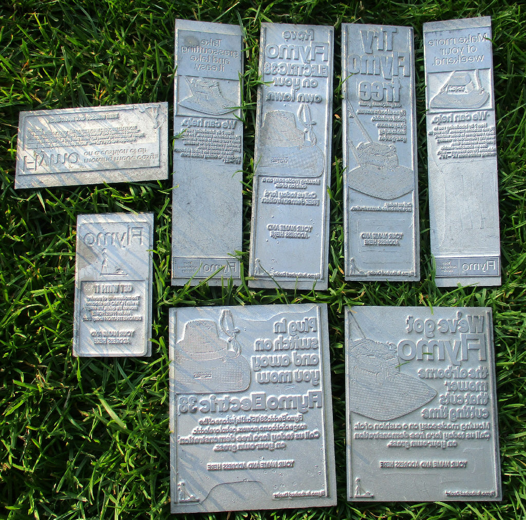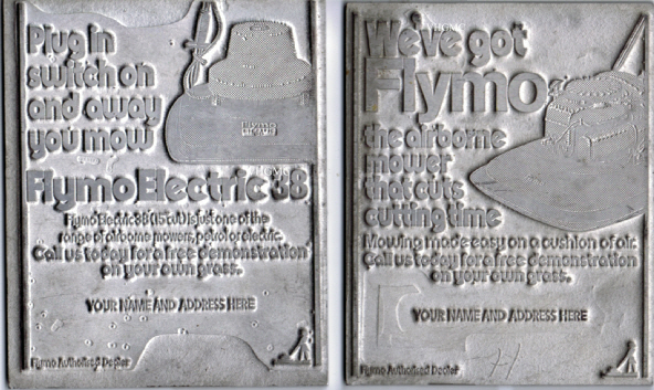 Flymo printing plates – the long ones measure 6″ x 1 column width (here 1.5″) for printing purposes. The square ones being 4″ x 2 columns width.