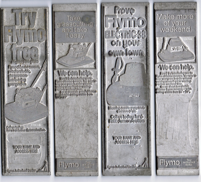 Onwards with this post. Sometimes things turn up unexpectedly, a brochure is good or an advert or even a price list with specifications and options. Yet to find cast printing plates for magazines and newspapers as shown in the images below is, although not rare, quite interesting nevertheless. I’m sure many thousands of printing plates were discarded, melted down or recycled somewhere, but here I’ve now come across a surviving selection of Flymo printing plates and, for a later article, some Atco and Ransomes ones too.