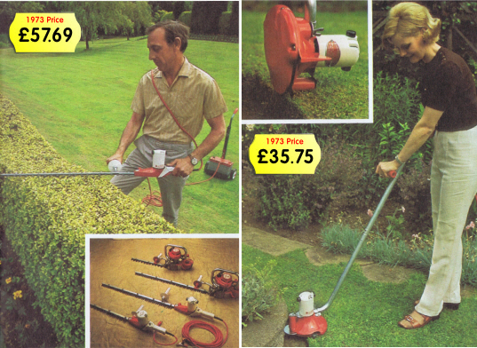 Once the lawn is cut then it’s time to do the edges and Webb come to the rescue with a battery-operated lawn edger. This talented machine has a 6 volt battery that can trim for about 45 minutes – about 1200 yards of lawn edges. It has a 7″ blade that revolves at 5000 rpm giving about 10,000 cuts per minute. Apparently it can trim lawn edges better than they have ever been trimmed before – I think some professionally trained groundsman might have disagreed with that statement but they probably agree that it was a lot easier than using long-handled shears. Two other items that Webb were selling at the time were from the Little Wonder tools range as pictured below. The Little Wonder edger and trimmer which was an electric strimmer and available as either 12 volt battery powered or 240 mains. The Little Wonder hedge cutters were 240 volt mains or 110 volt from a generator, 12 volt battery, or 1 hp, 2 stroke petrol.