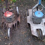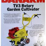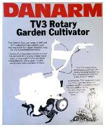 Danarm TV3 Texas Cultivator Advert7: B: Texas cultivators as in the image and painted yellow, were sold by Danarm in the 1970’s onwards. They were similar to the Merry Tiller design idea and the De-Luxe model was powered by a Briggs and Stratton 3hp engine, later, Kawasaki engines were introduced into the range. Attachments included steel bladed wheels and pneumatic wheels, tool frame with harrows, and end-discs to protect plants at the sides when cultivating.