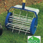 A: Bluebird lawn scarifier B: Tudor aerator (illustrated, right) C: Mowrite Auto-Spike attachment for power mowers