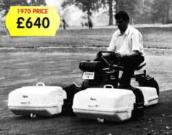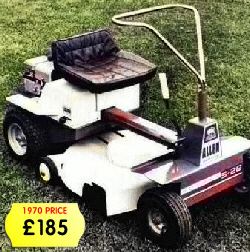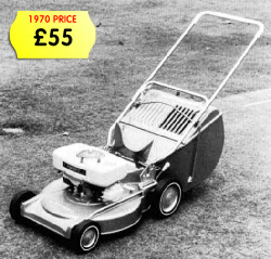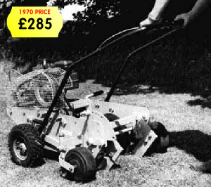 The machine pictured was newly on sale for 1970. It’s claim to fame being that it was believed to be the first power-driven gang mower that could also collect grass with it’s attached grassboxes. The grassboxes are fitted at the front of the front two cutter reels and the back grassbox is fitted to the rear of that cutter. Price: £640.