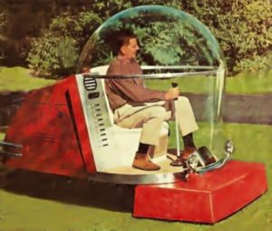 Horticultural machinery hasn’t, on the whole, faired much better; mowers, tillers and rotavators etc are much the same as they’ve always been, with just minor tweaks and amendments to make them better to operate. But where could we have been if madcap designers had pushed through their ideas and the general public had clambered aboard? Take the 1960’s prototype mowing machine as pictured above. This glass-domed futuristic machine encased the operator in an air-conditioned capsule from where they could mow the lawn, apply fertilizer, or according to adverts even go to the shops. In our health-conscious era the ideal solution for mowing the lawn is to use a pedestrian mower and get some exercise and fresh air rather than ride around getting sunstroke in a goldfish bowl – but a push mower wouldn’t be as much fun as that 1960’s Jetson inspired machine would it?