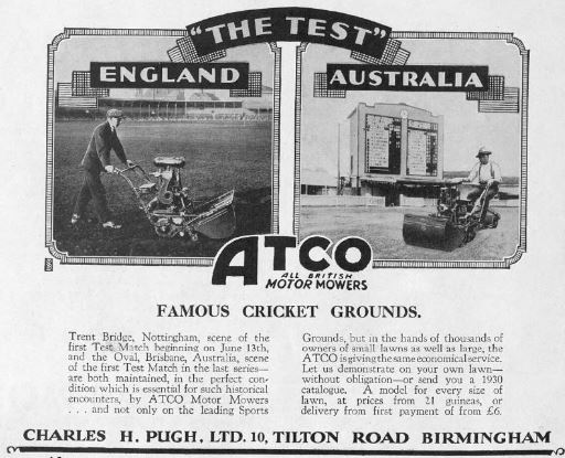 1930 Atco advert. Trent Bridge, Nottingham, scene of the first test match beginning June 13th. Also the Oval, Brisbane, Australia. Both maintained by Atco lawnmowers.Atco lawnmower used at the Crystal Palace, London, since 1924. As shown in this 1930 advert.