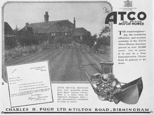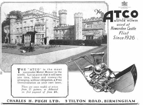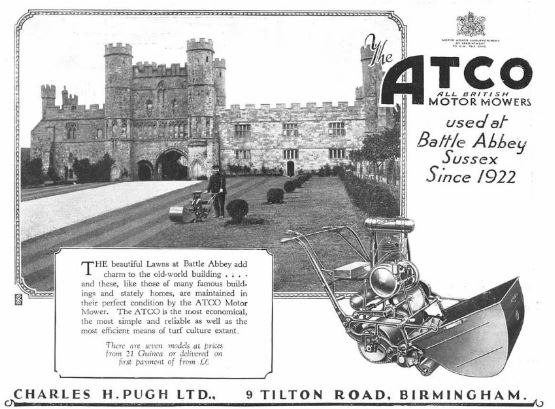 Battle Abbey, Sussex, had been using Atco lawnmowers since 1922. Advert from 1930. An Atco lawnmower was used by Sir Algernon Guiness at his home in Henfield. The property still exists but the pristine lawn does not.Atco mowers were used at Hawarden Castle, Flint since 1926. Lord Birkenhead used (or rather his gardener did) an Atco mower at the Italian gardens of his residence at Charlton, Banbury.