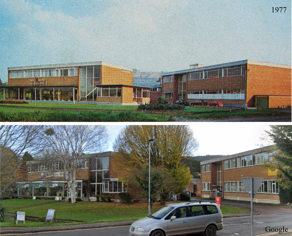 The third photo, from 1977, shows the front of the main building on the left looking onto the front lawn – the large glazed windows showing a display of Wolf products. The same view is shown in the last image, which is from 2022.