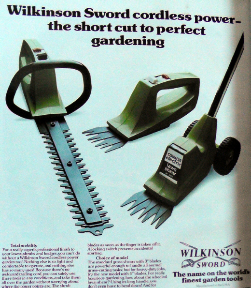 Where battery power is really useful is with hand tools, these are mainly shrub and hedge trimmers, lawn edgers, and a few domestic lawn strimmers. Again, there have been models from different manufacturers over the decades but none have really captured the imagination of the public and the models have been reasonably short-lived (apart from the really useful Spintrim lawn edger). Machines have kept being designed, made and advertised over the years and, to name just a few, have included the aforementioned Spintrim lawn edger from Bob Andrews in the 1960s and ’70s; also in the 1960s and ’70s shrub trimmers from Wolf, Black & Decker and Wilkinson Sword (see the 1974 advert below), and Sandvic cordless grass trimmers in the 1980s, and battery trimmers from Flymo in the 1990s. As can be seen, the decades kept on giving cordless machines from many manufacturers.