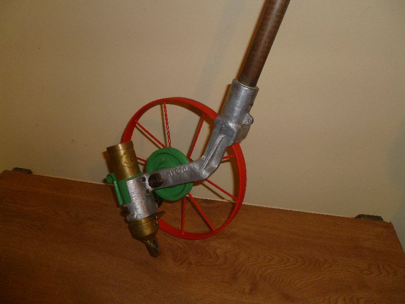 Just had another look at the pictures in the brochure and the first one sowing seeds into the seed box appears to be the brass seeder section from the MYSTO number 3 seeder as in my photo. As the seeder wheel rotates against the wooden guide bar on the top of the seed box the seeder will sow seed into the box.