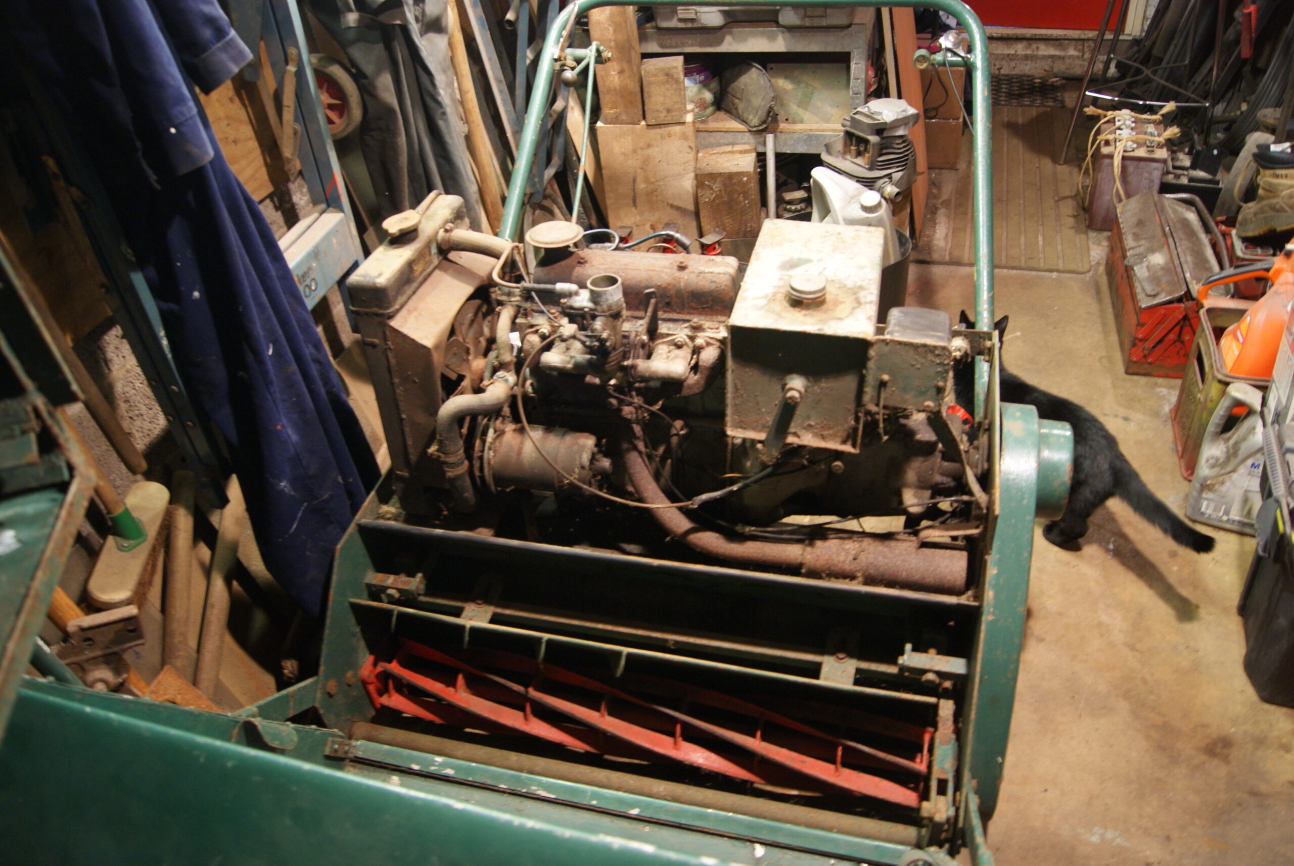 I’ve spent most of the day on the Allett today. First off was to remove the grassbox and carrying brackets- I’ve got enough lumps on my shins from walking into Mastiff brackets so I’m determined not to add to the collection. Even the grassbox has had a lot of thought behind it so that the carrying bolts will act as pivots to empty it; the washers behind the bolts are stepped to provide a bearing surface on the carrying arms. I always thought that these mowers would be young enough to be made with UNF threads but all of the grassbox bolts and nuts are BSF. This theme was carried through to the thrower plate behind the cylinder, so I’m guessing that the whole mower is BSF throughout. Contrast that with the Reliant engine which seems to be UNF so far and it means that I’ve got most of my toys out of the box. I haven’t come across any metric threads yet but I won’t make any rash predictions at this stage.