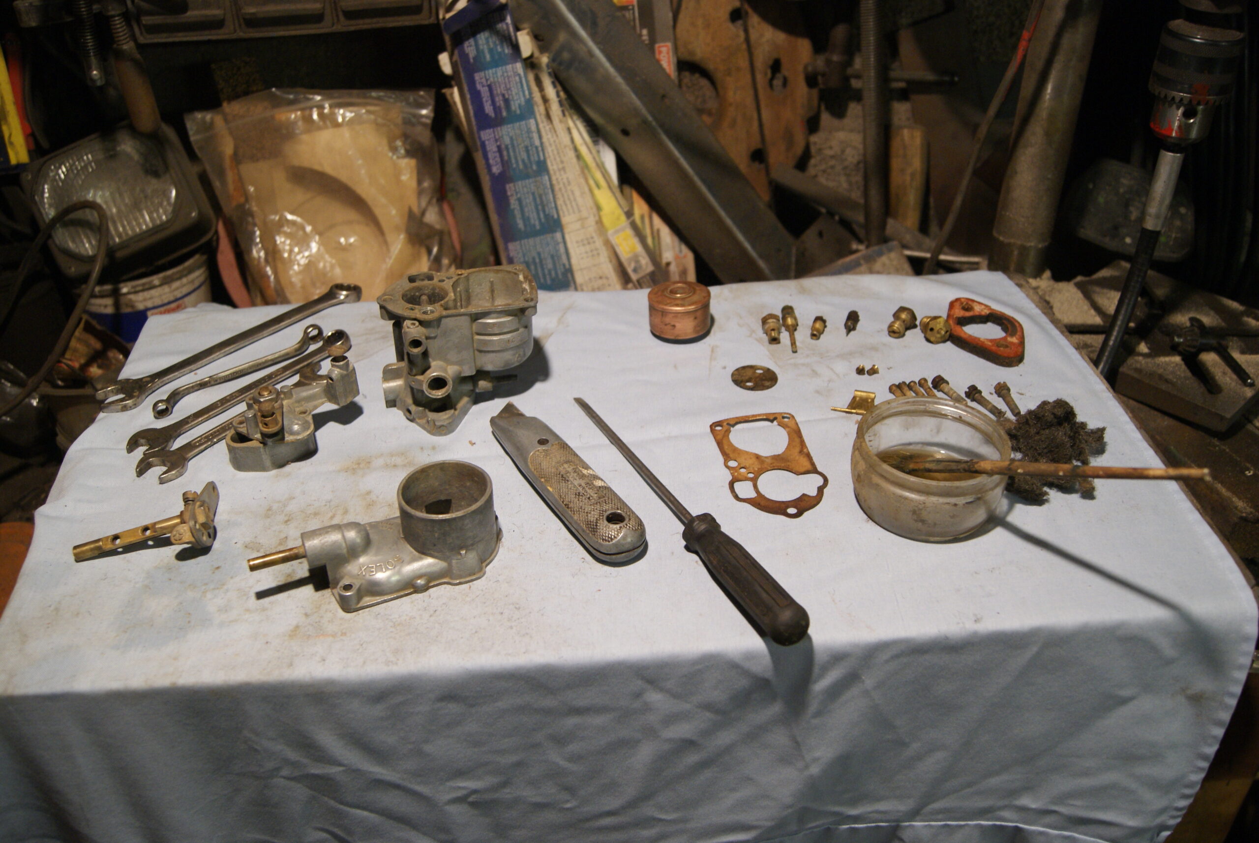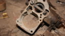 First major target for the day was to get the engine running properly, so off came the carburettor for a thorough clean inside and out. I always find that brake cleaner works the best on baked-on dirt on the outside but in this case it was that stubborn I had to soak it in a bath of petrol then rub it with fine wire wool. Several applications later it was good enough to pass muster so I started putting it back together; luckily there was nothing really wrong with it and the excess fuel causing the engine to run too fast was down to the choke assembly sticking inside the body of the carb. The actuating arm on the outside was in the correct position but the internal mechanism is pushed back to the “off choke” position by a spring- this was stuck with debris, so a good clean achieved the desired result.