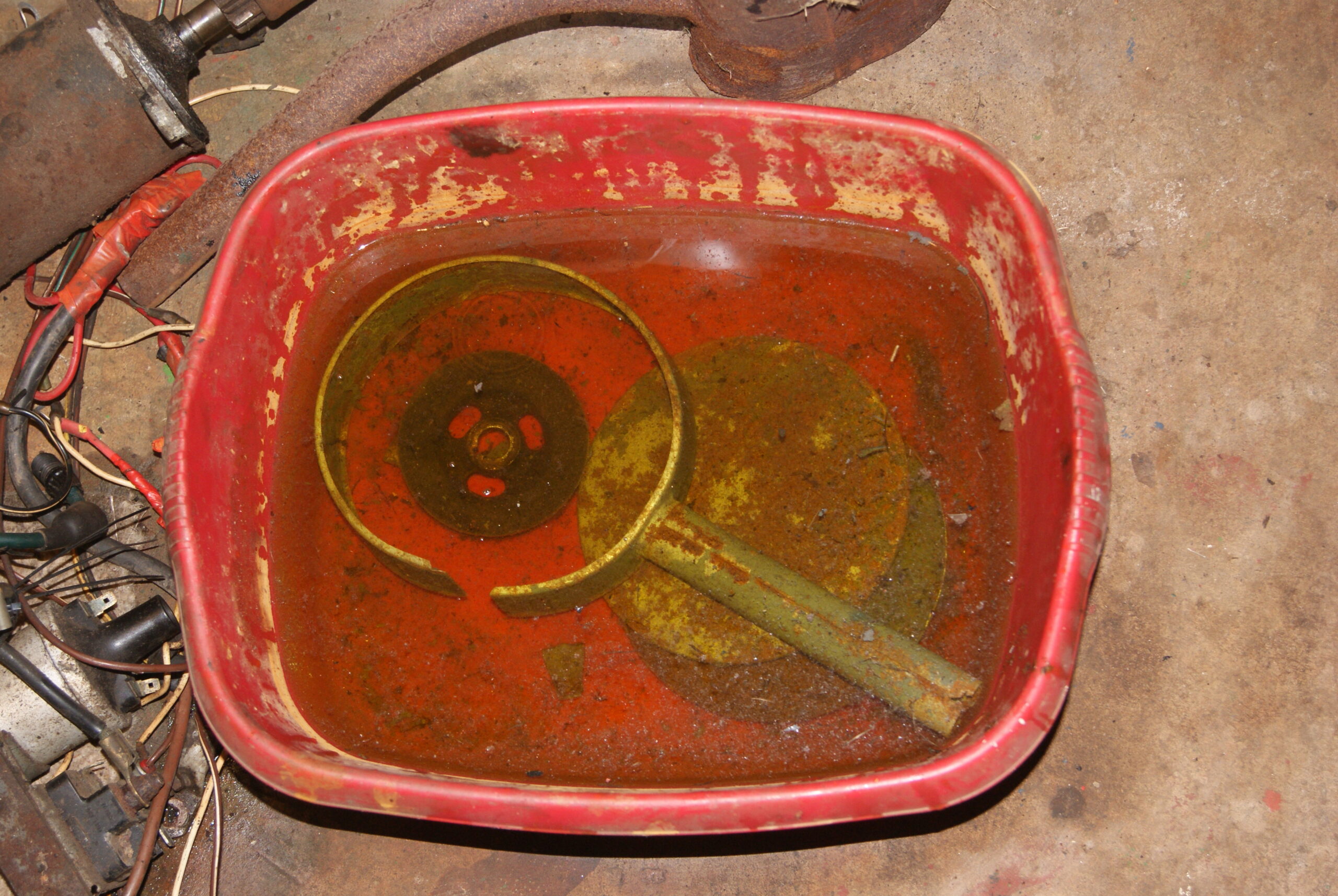 trusty220KeymasterI thought for this update I would start with some comparison photo’s of old and new so you can see what’s available. I’ve also included a photo of the exhaust downpipe so you can see what kind of results that you can get from using the brick cleaner method of de-rusting; the dividing line is very clear cut and you can see for yourself why I do it. It’s ideal for more delicate items that won’t stand up to rotary wire brushing and it does leave the surface clean and rust free with no brown staining.