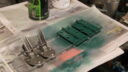 The gold paint ended up a mixture of gold leaf and brass colour- brass being quite a bit darker but not as dark as bronze; I used Humbrol enamel, mixing gold and brass in equal amounts to get the shade right.