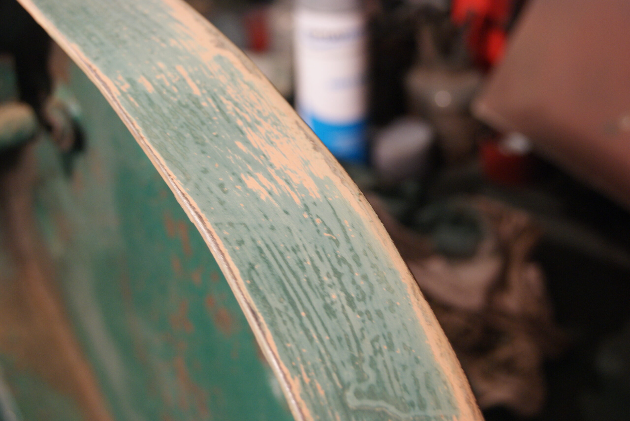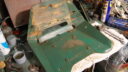 wristpinParticipantIt really has been some time since I updated this story but I haven’t been slacking. The main piece of news is that I’ve had a minor disaster with the fibreglass lid; it had many dents and scratches which I was filling with stopper (a very fine filler used for small imperfections) but when I went to flat them back to blend them in with the rest it proved impossible without rupturing hundreds of microblisters. It looks like somebody in the past has repainted the lid with a high-build primer/filler; this was coloured orange. The green paint was applied over the top of the orange primer but because the surface preparation was not good enough at the time, the primer/filler has lifted in hundreds of blisters and lifted the green topcoat with it. What this meant in this case was that when I flatted it down it left lots of orange spots in the green paint- not a good look!