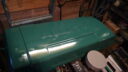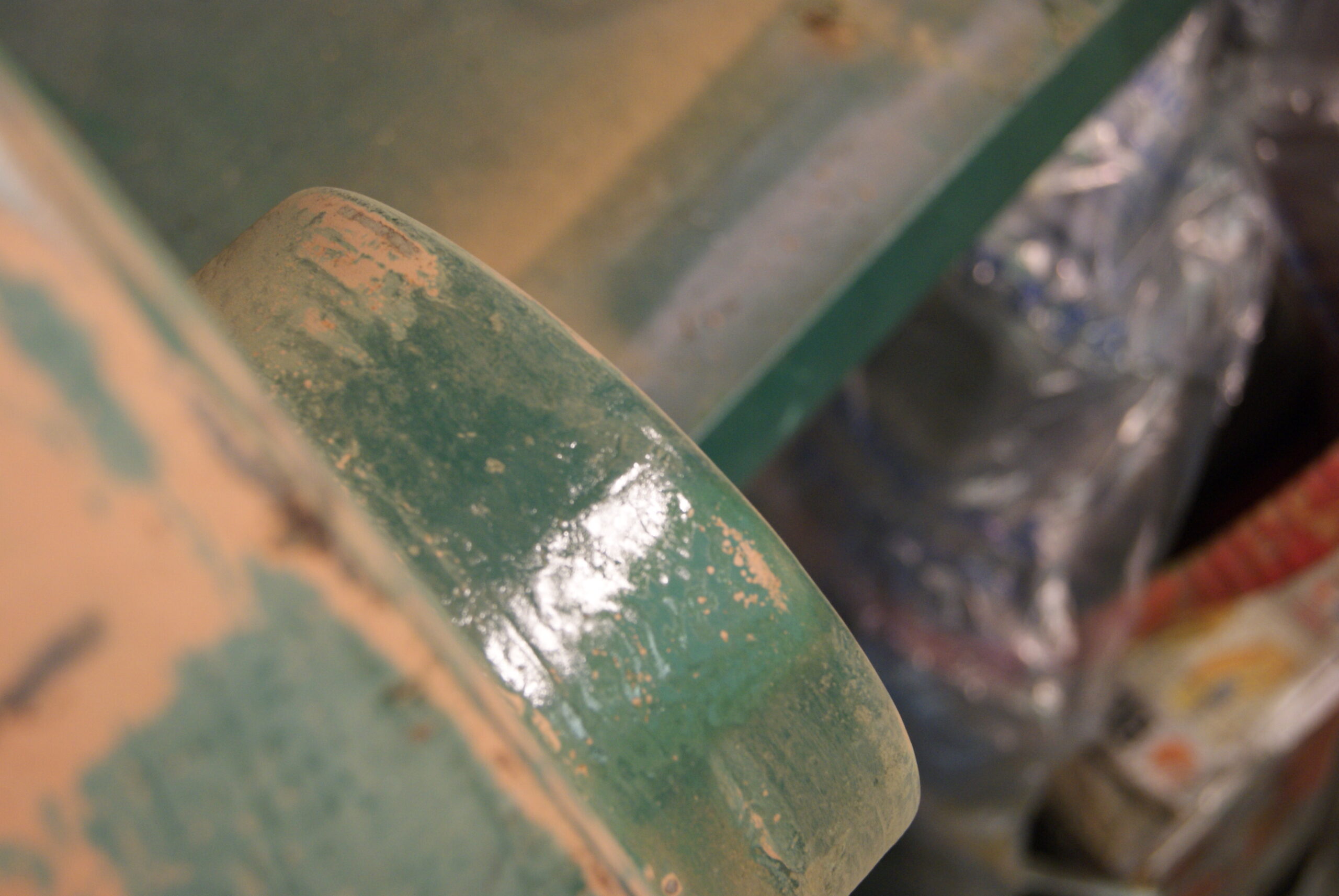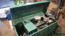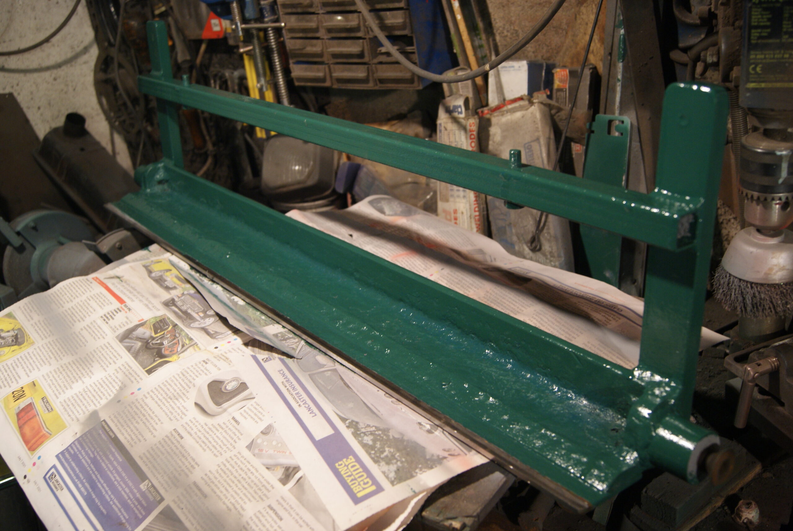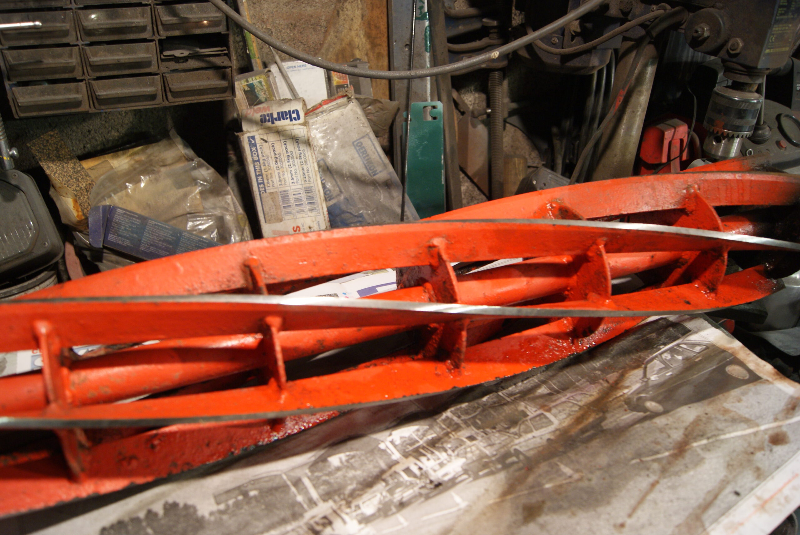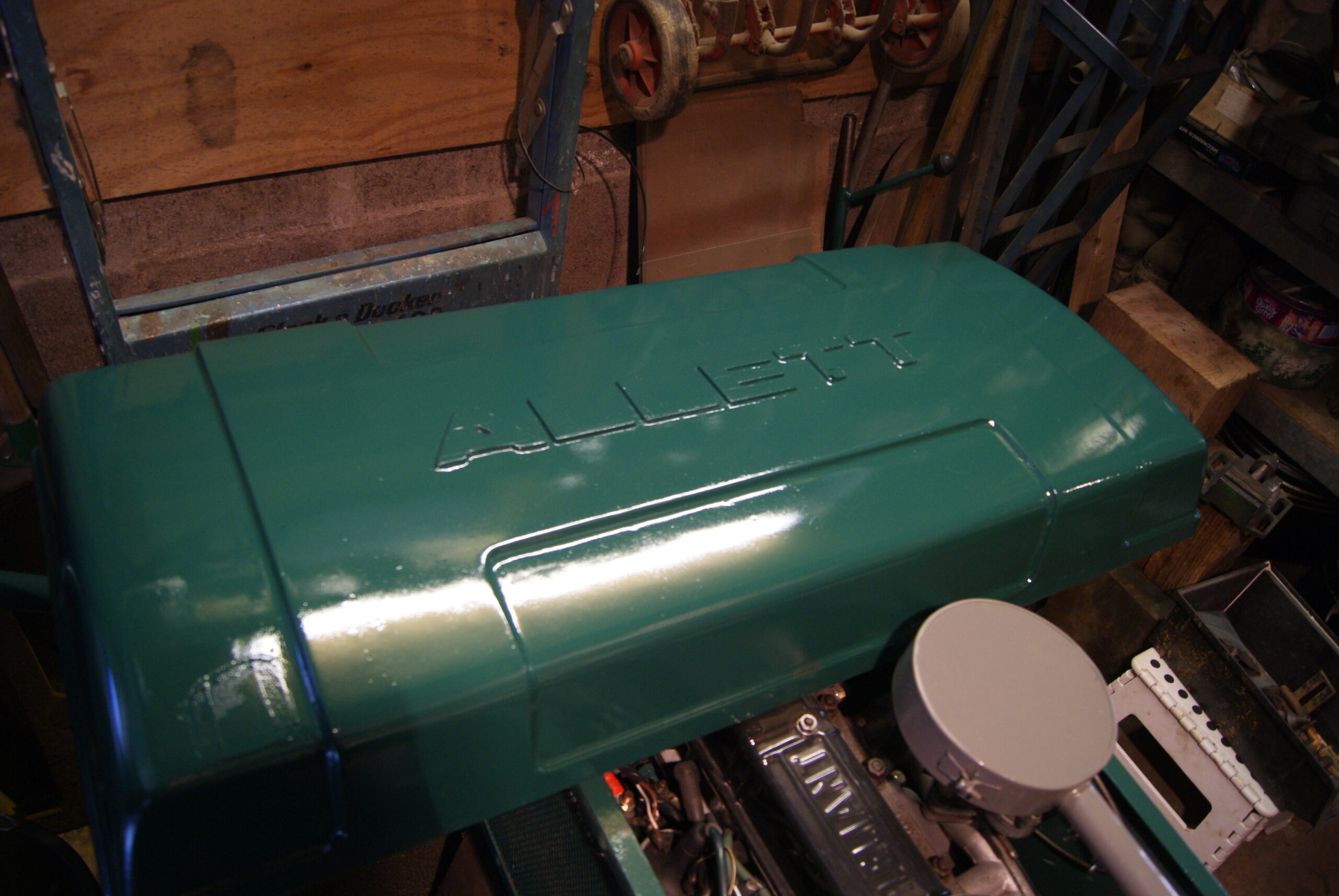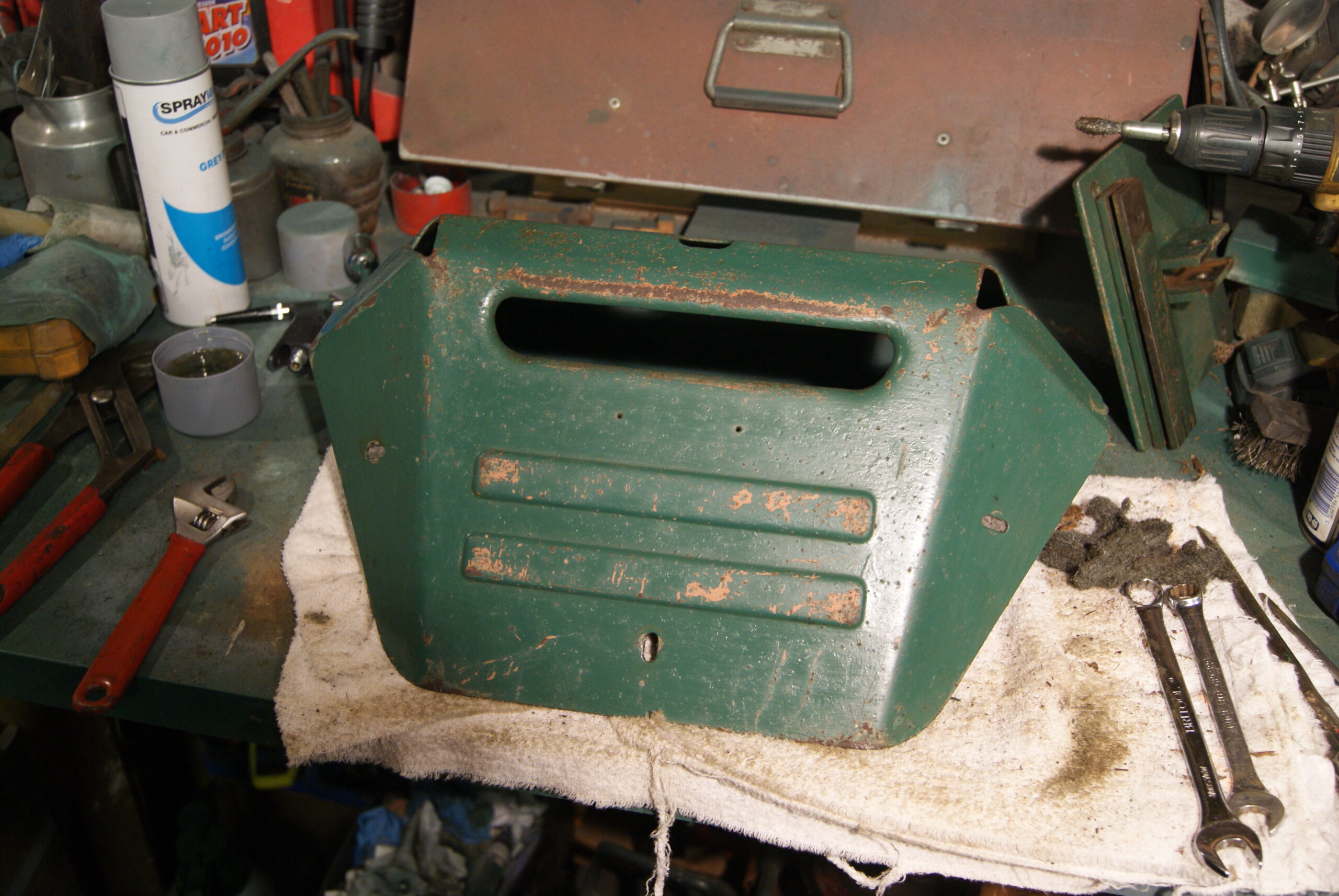 The guard is a steel fabrication, made up of various parts all welded together. When attempting to flat out the brush marks I came across the same orange pimples showing through the green topcoat, and on closer inspection it appears that the primer used was very thick and lumpy, probably a result of using an old tin and not being too careful about straining it before use. The brush marks simply would not flat out before the orange primer made an appearance so the whole guard was taken back and re-finished; at least that explains the lid! The inside of the cover looked to be the original green paint, applied with no primer, and so I thought I’d leave that untouched as it is as a record for future restorers to use as a reference to match the paint, plus they can see what the original finish was like.