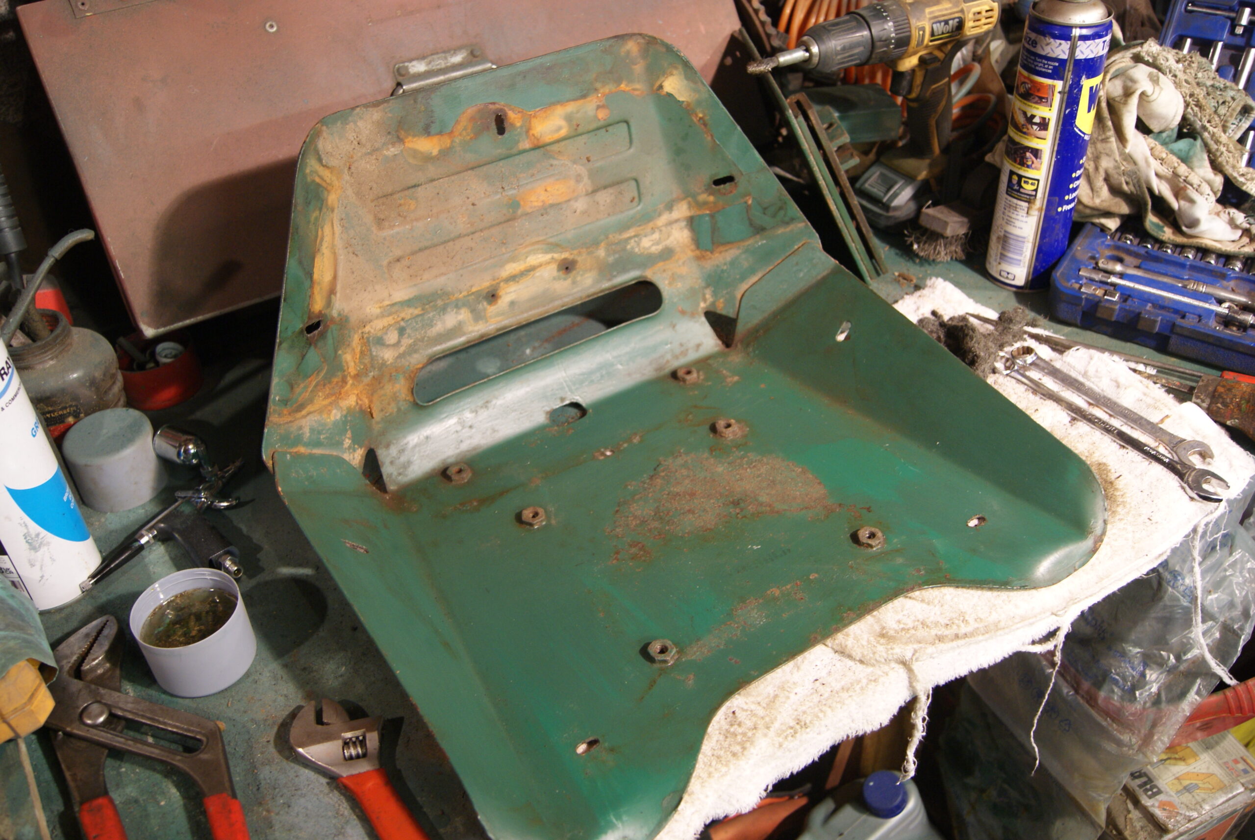 A judicious amount of elbow grease and wire wool later the seat assembly does look acceptable; it has rust and primer showing in a few places but nowhere near as bad as the mower was, so I have every confidence that it will clean up with no trouble. There is a split in the front edge of the cushion where drivers have got on and off over the years, so I’ll have to hunt out a vehicle trimmer to see if it can be repaired easily. To my untrained eye it looks straightforward, but then I’m no expert!