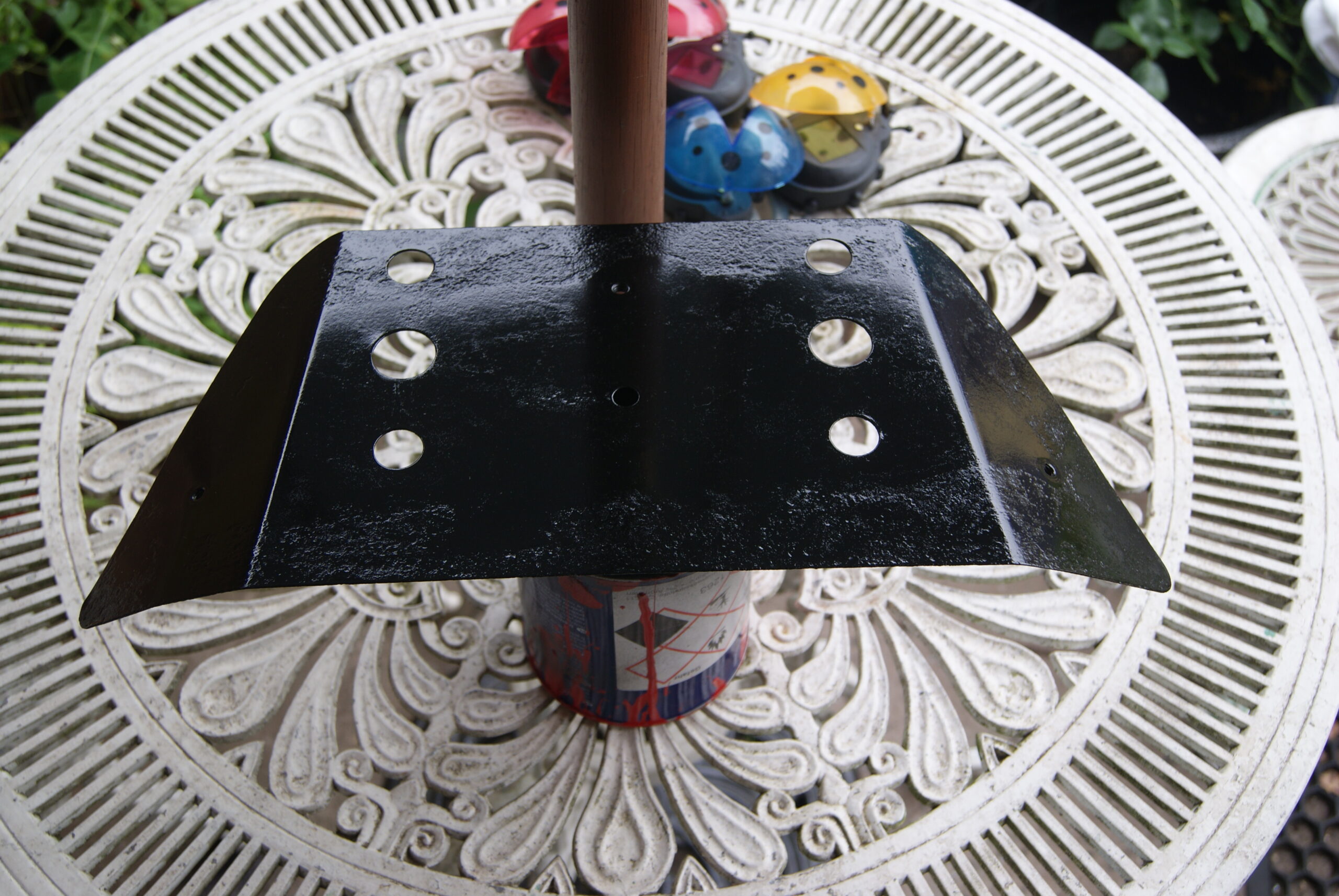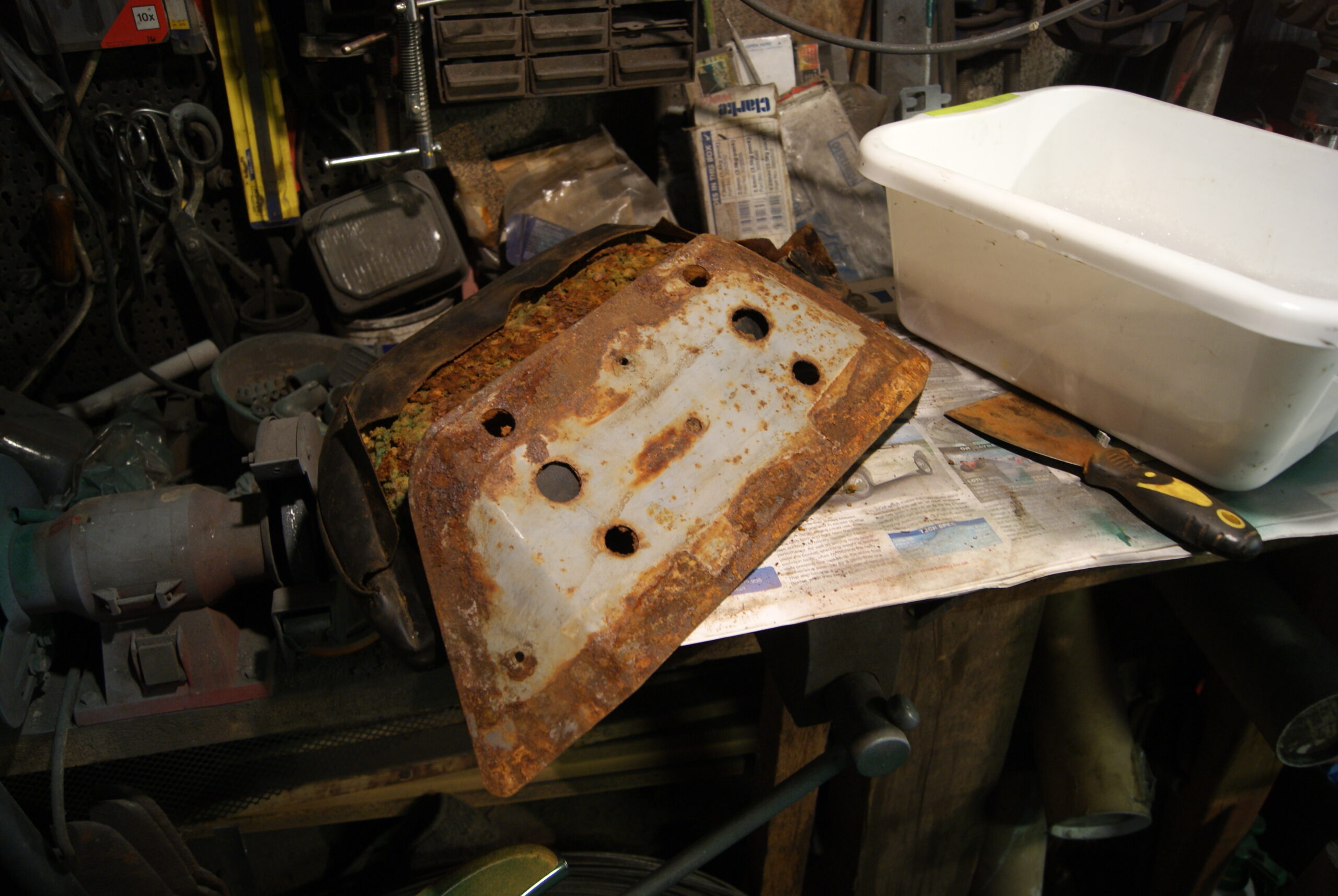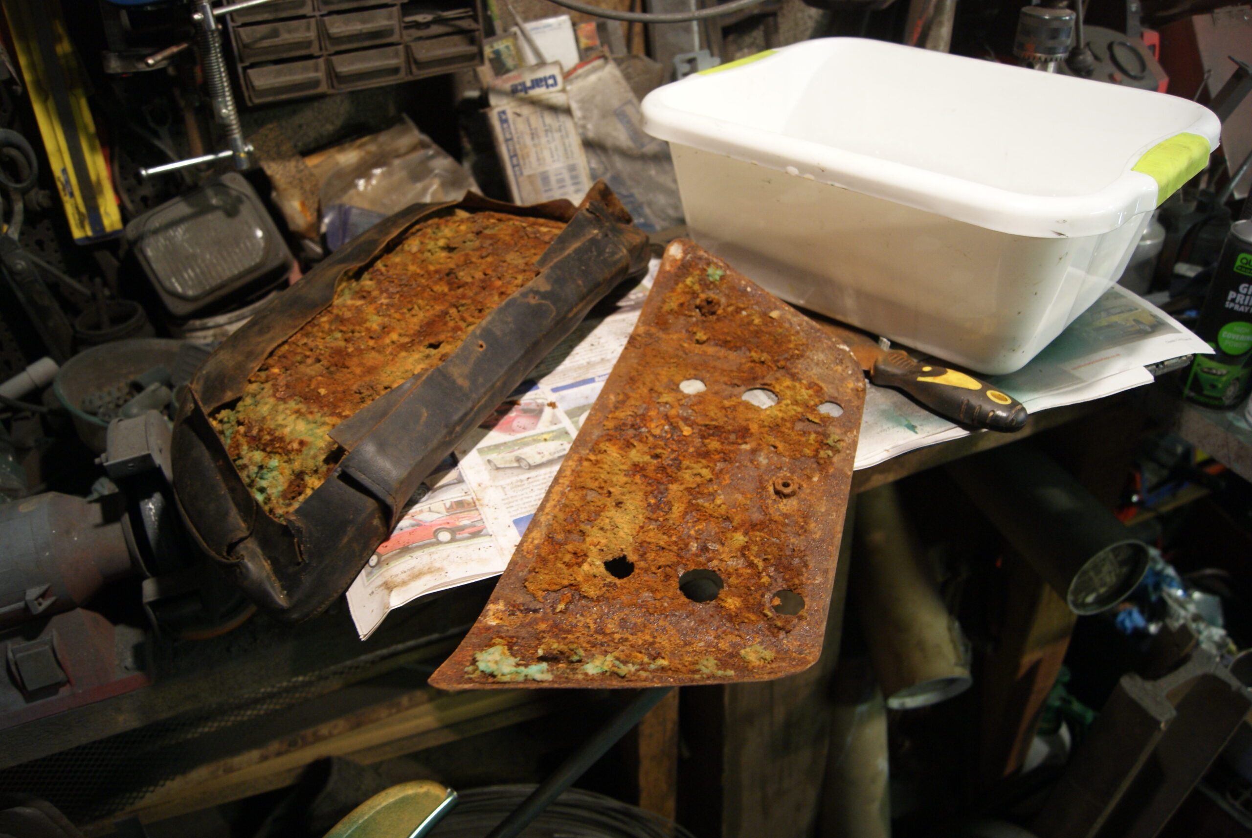 trusty220KeymasterOn closer inspection the seat cushions were suffering from age and the foam filling was starting to go hard. I’ve got the same problem with the GT6 and every time I sit in the driver’s seat a trickle of powder comes out of the bottom of the seat; I’ve tried losing weight but it doesn’t seem to make any difference. Fearing that this seat is getting close to the same state I think it best to get the cushions re-padded and at least that will be good for a few more years yet. You will also see that once I separated the foam from the steel backing plate, the rust had just taken over inside so it was a good thing to dismantle it. I have now cleaned the plate up and it’s sitting in the garden with a good coat of black Hammerite on it; I haven’t taken much care over the finish as it won’t be seen once assembled, and the rough surface will give glue on the outer cover something to grip to.