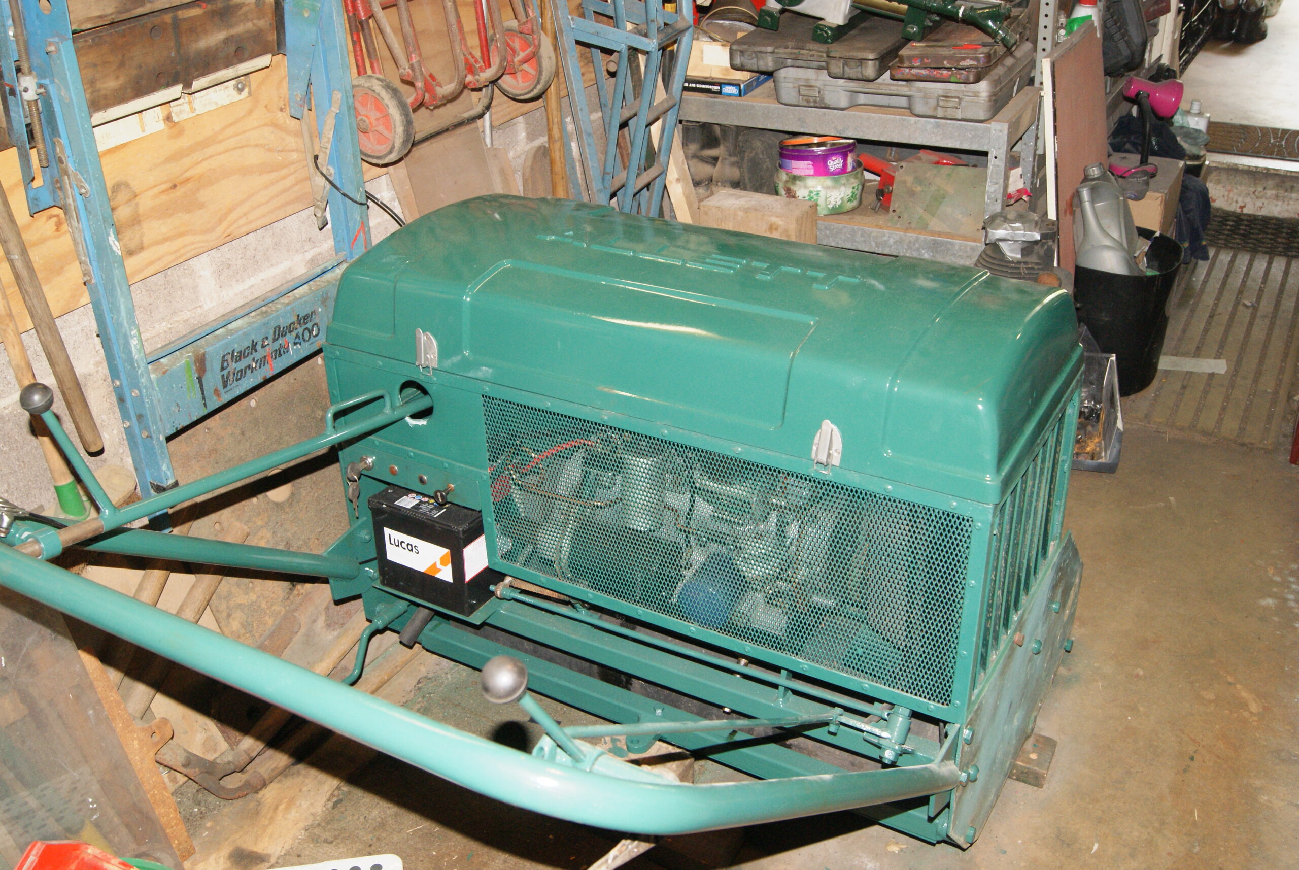 The rest of the day was spent tidying up loose ends such as attaching the hinges to the lid, the catches on the back of the lid and touching up heads of bolts that needed a coat of green paint. I’ve even gone to the trouble to wash the stays for the lid- these are made from lengths of recoil rope that loop through parts of the framework and stop the lid from going too far and breaking. It would have been easier to use some new rope, but there wasn’t much wrong with the originals and I’ve tried to keep as much of the original machine as I can with this rebuild.