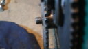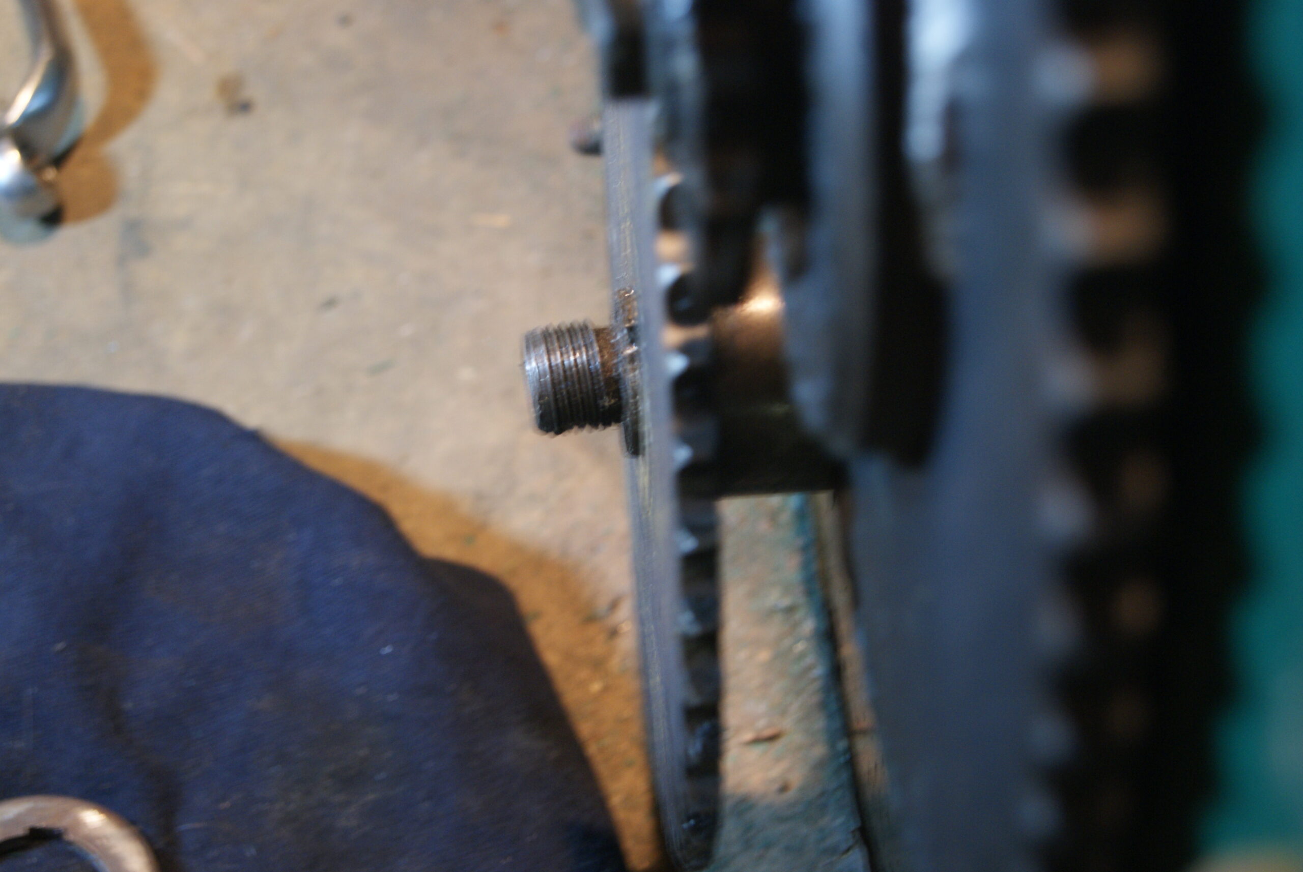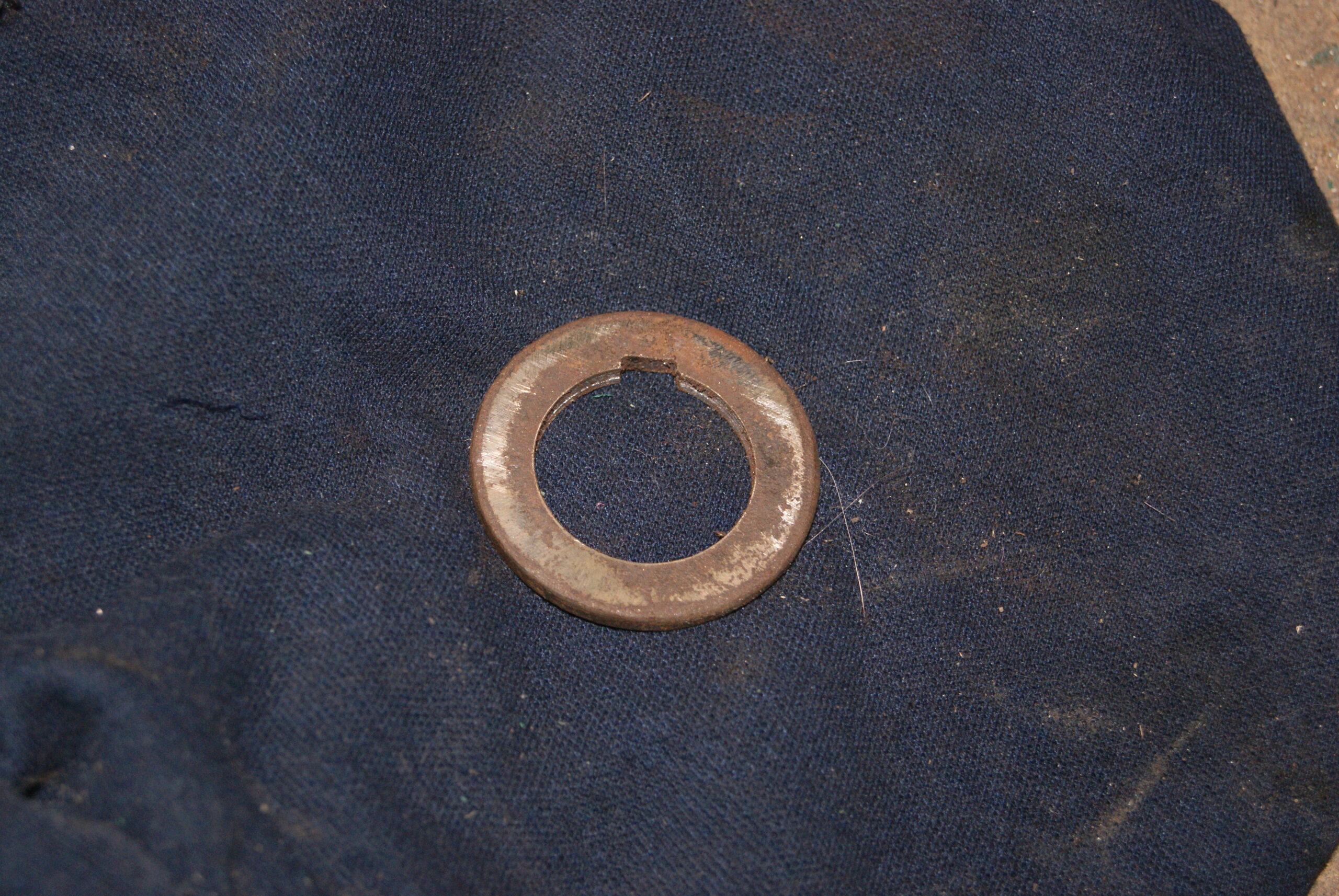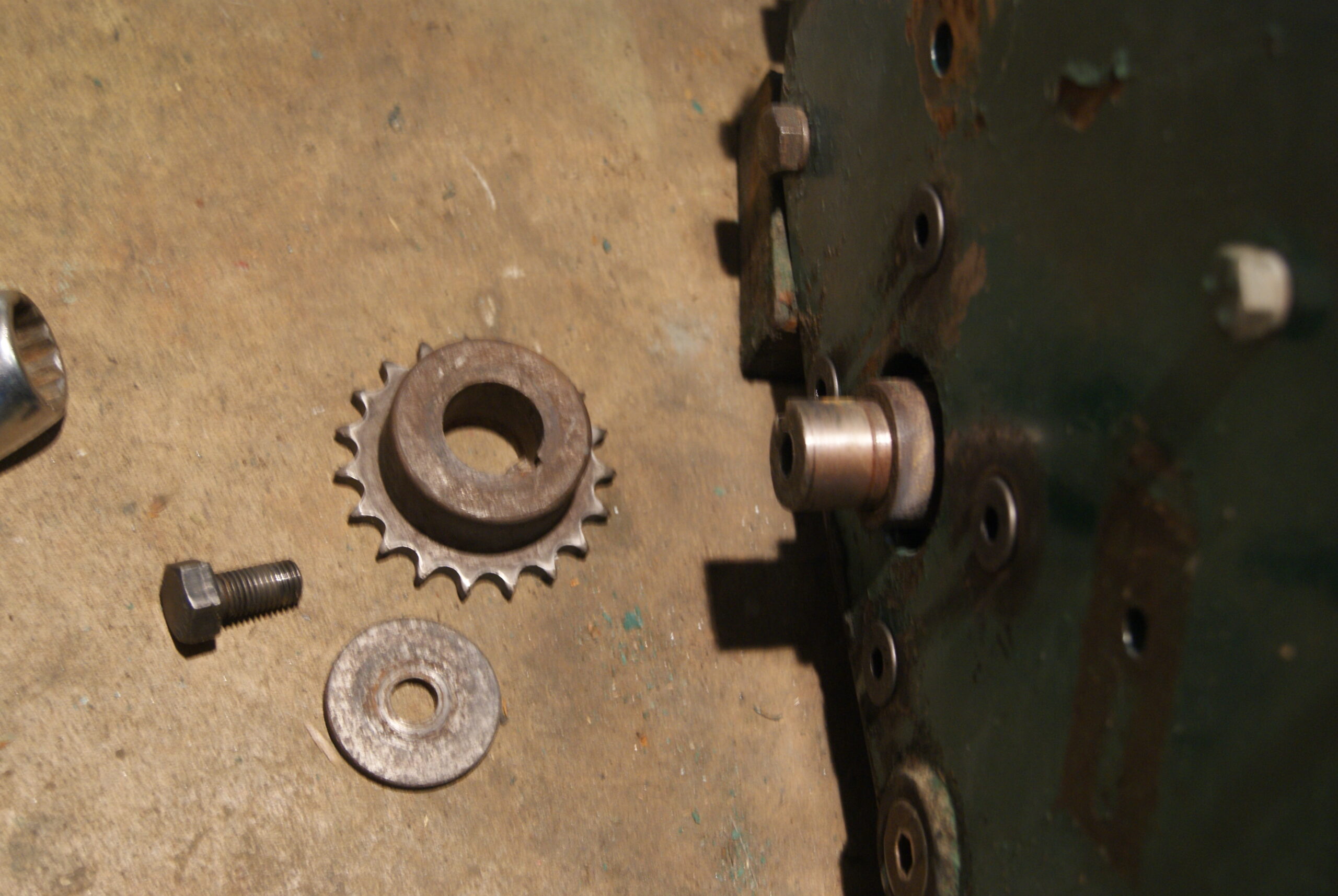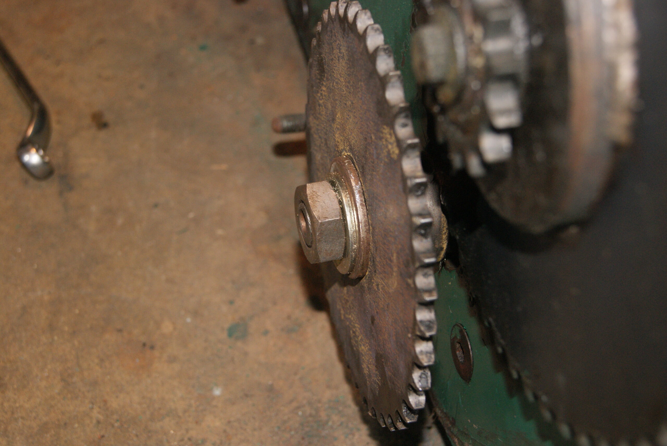 A new key was filed up and the old keyway used to seat it in. The sprocket was then pushed onto the shaft right up to the shoulder- it was then that I discovered that the boss was too short by about 60 thou and the shaft was still sticking out of the end of the sprocket. An appropriate spacer needed to be made, so an old Trusty washer was cleaned up and opened out with a step drill then a slot filed in it to clear the key which was also making a short appearance. Once that was on, a plain washer and the nut were then wound down and a finish tighten applied. It all looks tight and business-like so I think I’ll breathe a sigh of relief at that stage.