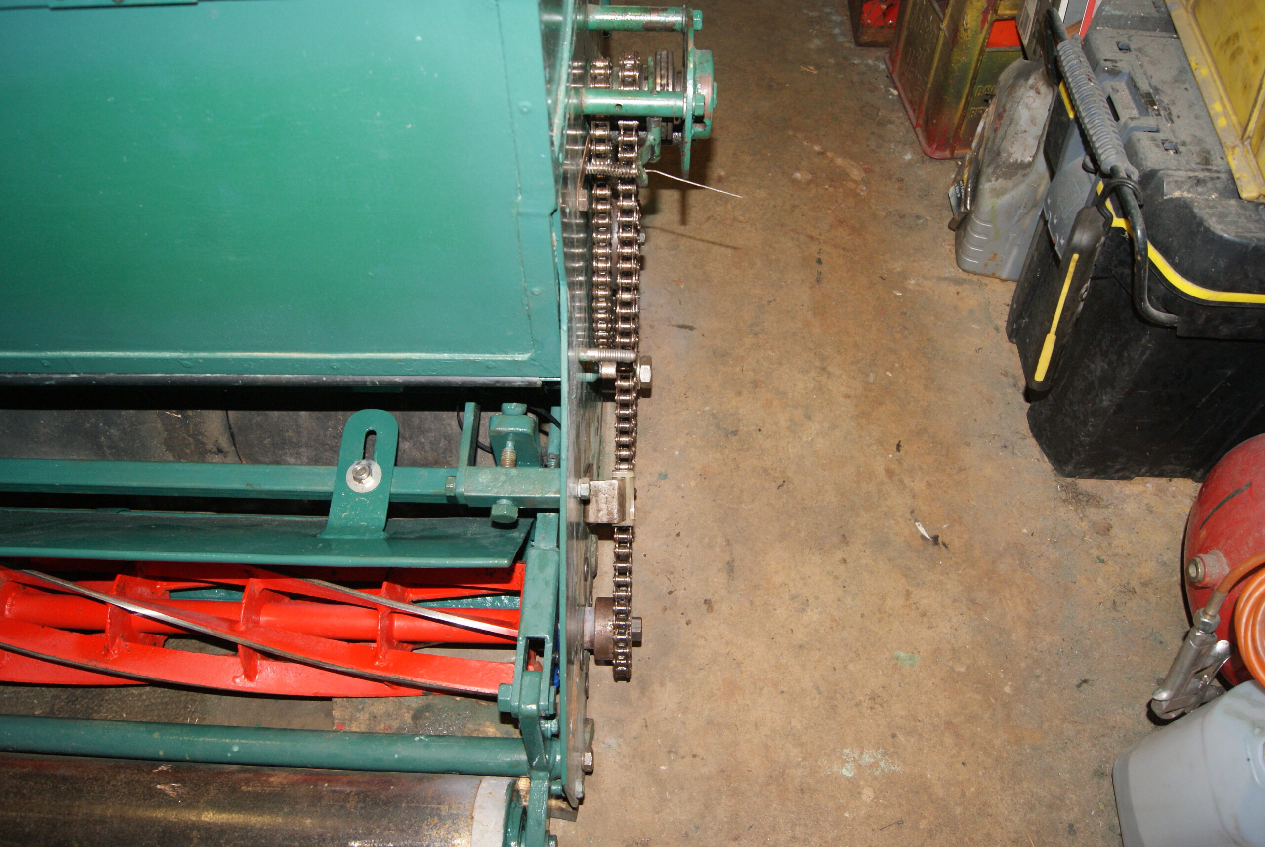 On Sunday I masked up the cutting edges of the bottom blade then gave the whole carrier assembly a coat of primer and Allett Green. This morning it was dry enough to handle, so I fitted that as well and adjusted it up using the four-point adjusters. In this machine the cylinder is bolted rigidly to the frame and adjustment is done by moving the bottom blade up to the cylinder; the advantage in this is that the cutting height remains constant as the bottom blade wears. If you bolt the bottom blade rigidly to the frame it does give a very strong structure but the height of cut gets lower as the bottom blade wears.