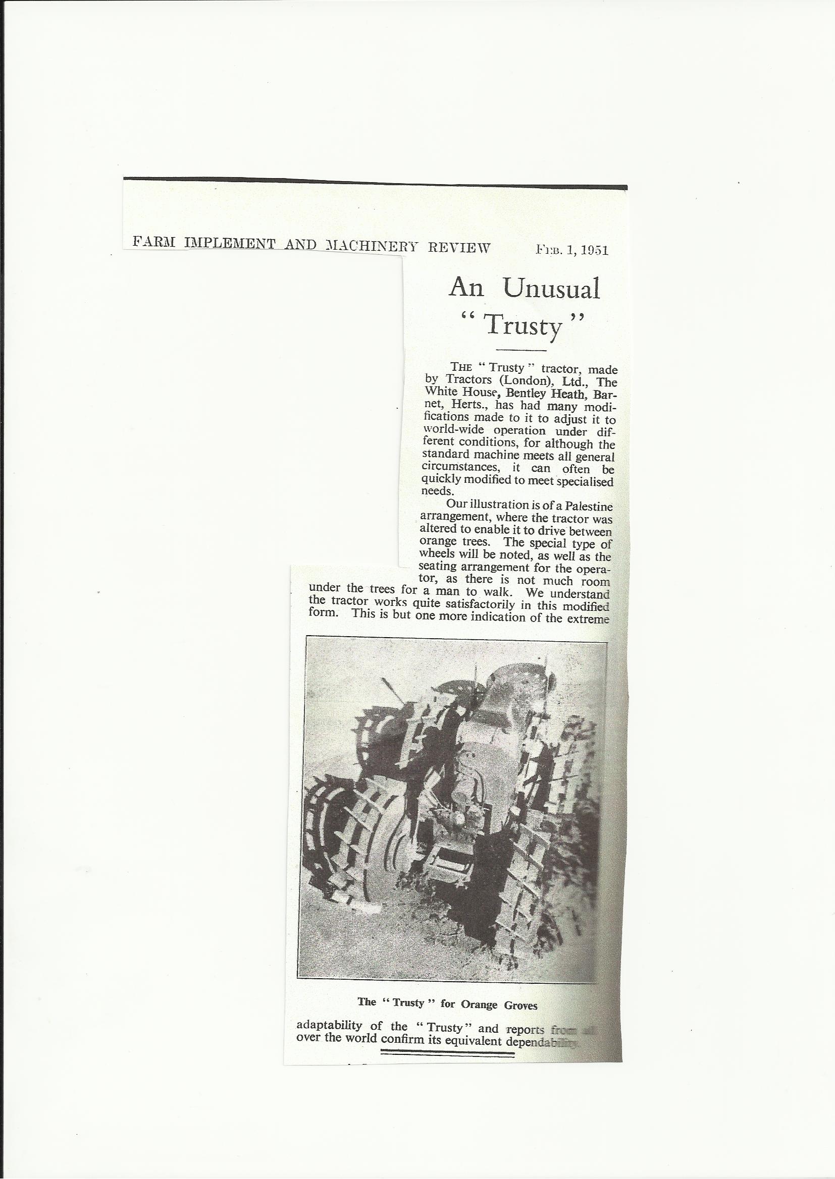In the Farm Implement and Machinery Review of February 1951 there is a report from Tractors (London) Ltd of a unusual Trusty produced to meet the requirements of orange growers in Palestine and called the “Palestine arrangement”