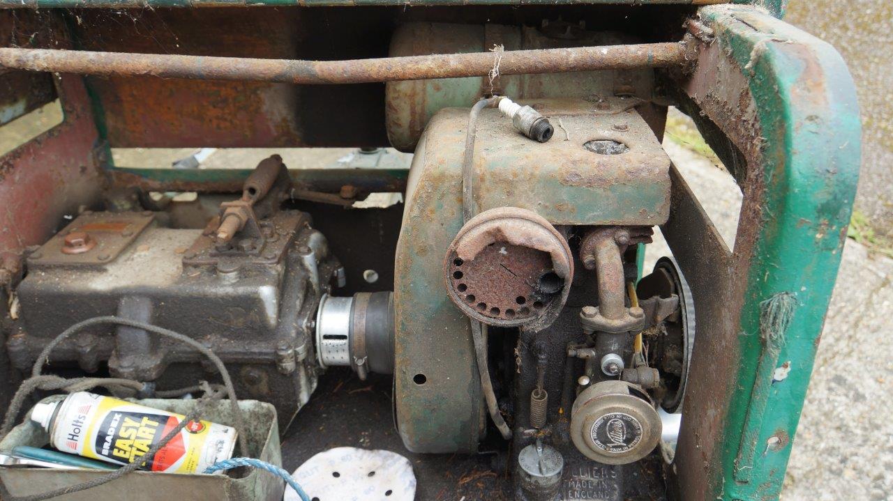 It has petrol, a cut off to the air filter to allow you to stop it, a single spark plug and a hand crank that requires you to wind rope around 4 turns and pull hard. It splutters and cough but without signs yet that it is firing.