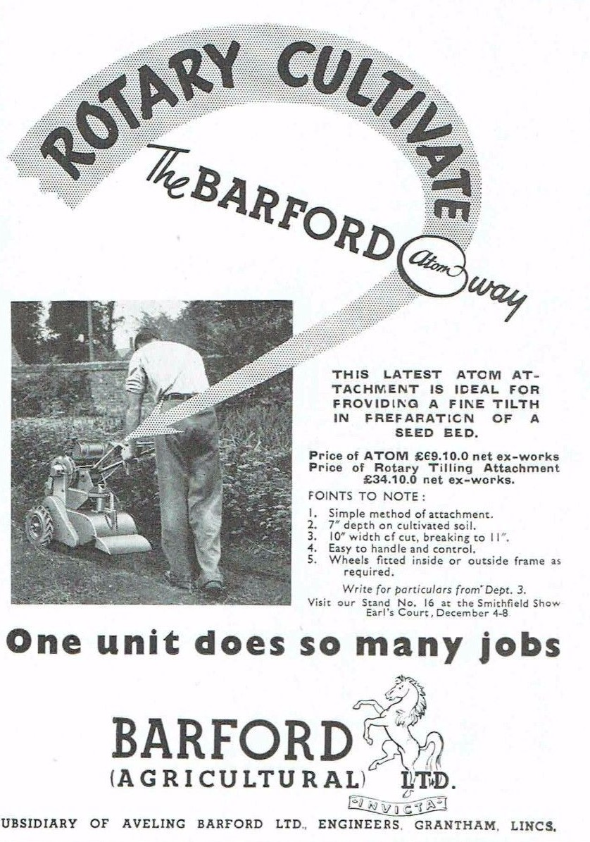 A recent purchase from that well known online auction site. An advert taken from a magazine which shows a rotavator attachment for the small Barford Atom (Mechanical Gardener). I have never seen this attachment in any other literature, has anyone else?