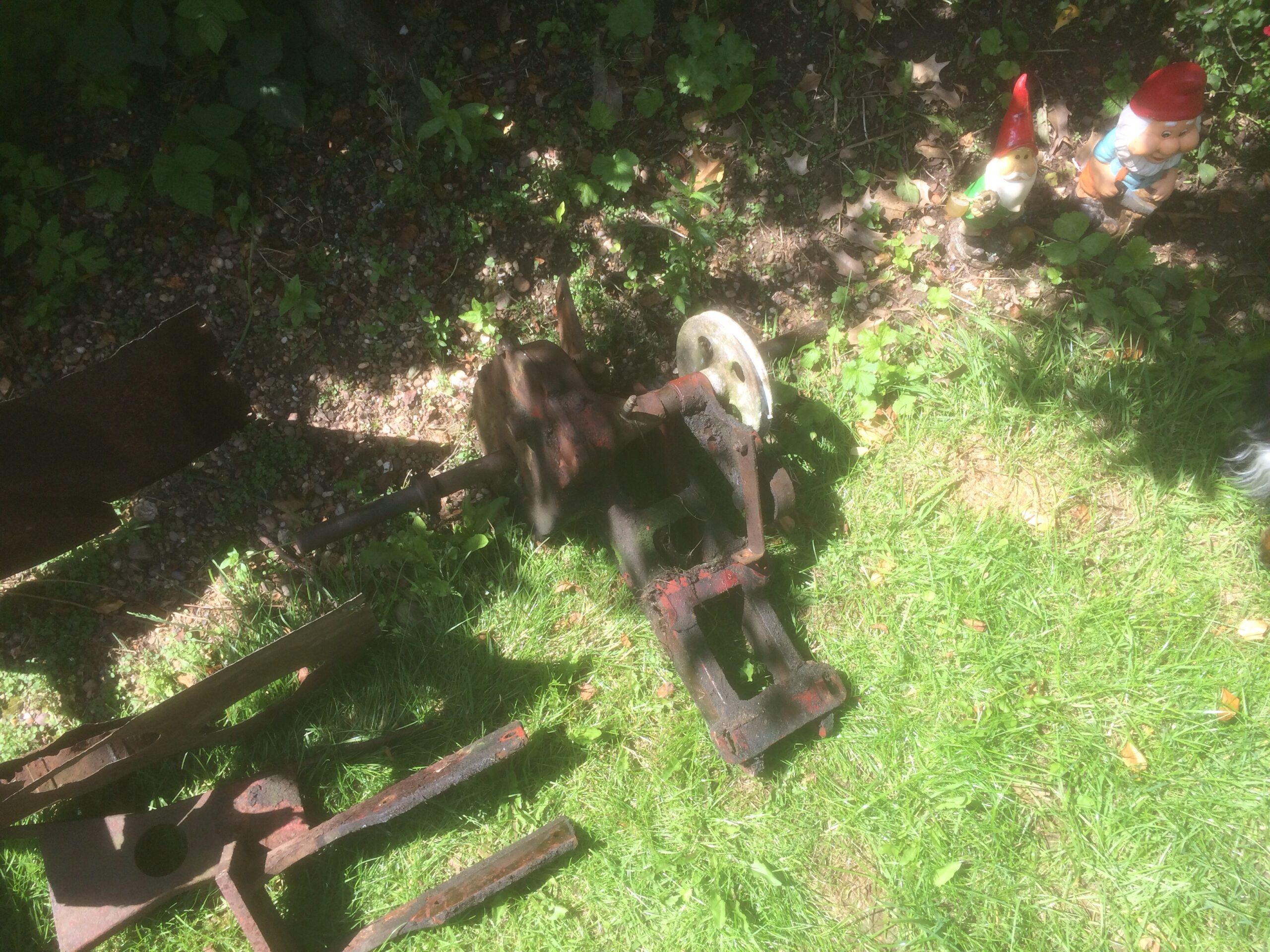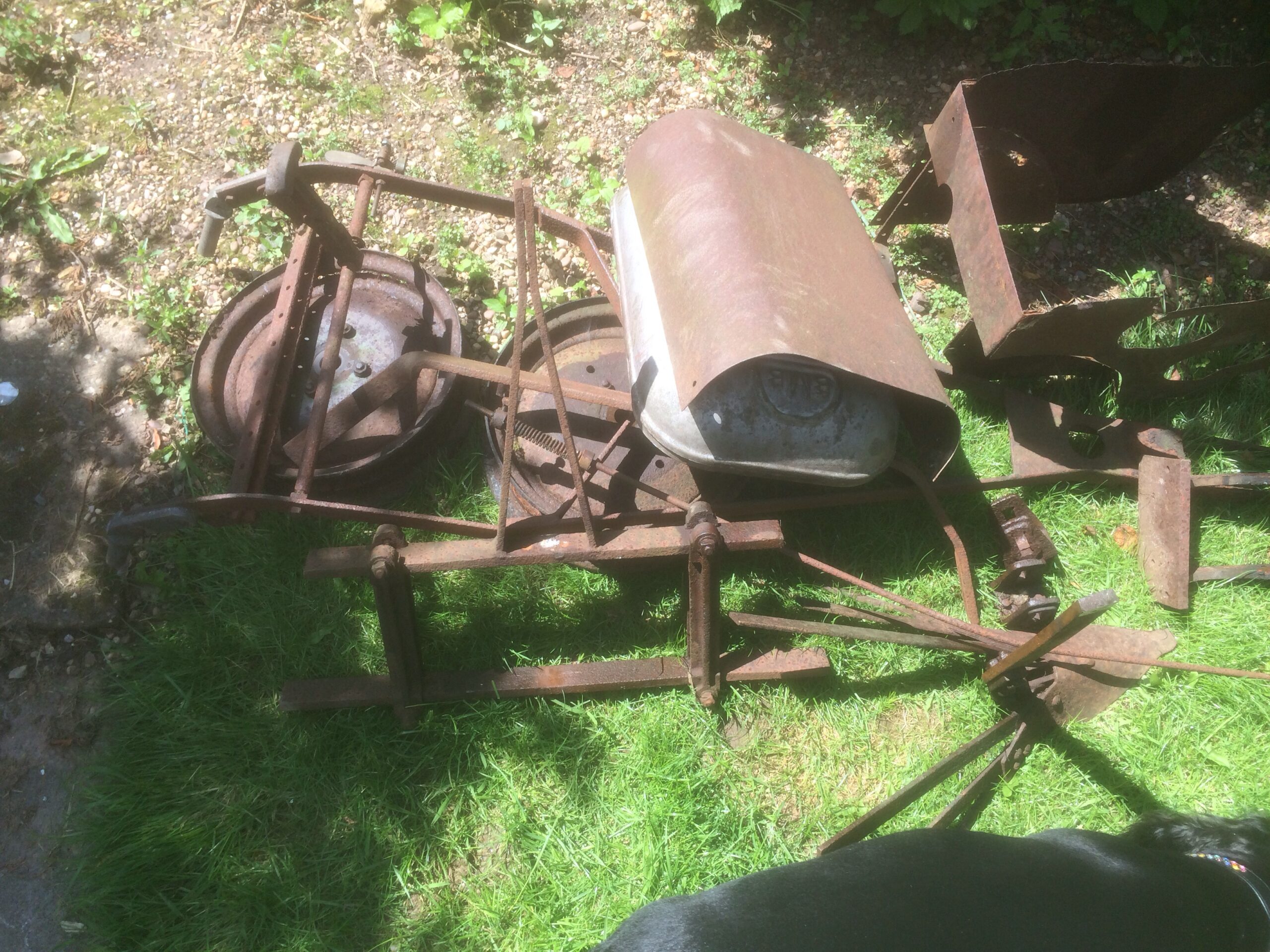 As mentioned previously I originally bought this hoemate to restore as is however on purchasing another one with even better tin work and mint rubber wheels I’ve decided to restore this so it looks the part but I will await the purchase of some spaded wheels and a suitable engine to get it running. The original engine from this one shall go into the better one stored in my garage. As this chassis will be stored outside I thought I’d get this one all painted up so it looks presentable (rather than a rusting hulk) I’ll do a second project on the other in my garage after this one is finished. Below are some photos before I started the last two are the machine in sub assemblies ready for cleaning and painting.