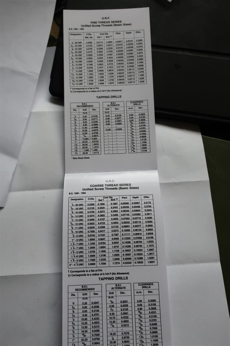 I have posted a link to the very useful Zeus tables for identifying thread types, drilling and tapping sizes etc here is an image or two of my copy.