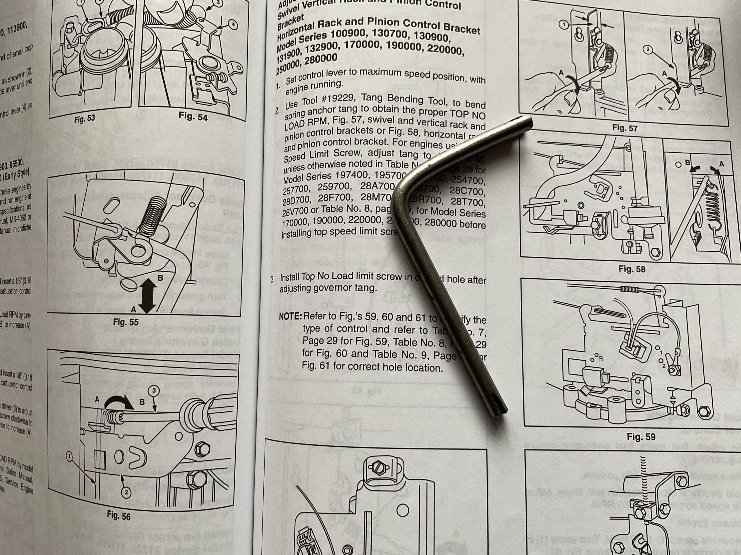 Re your comment about no getting full throttle – butterfly wide open. Being a governed engine it will not be wide open if it’s reached its governed speed. The engine Type number will give the governed speed for your application. If I get a mo, I will dig out the appropriate micro fiche – and the reader – and post the correct speed later; probably between 2800 and 3000. Even with the correct spring it may be necessary to tweak (bend) its anchor to get the exact setting. It’s covered in the manual.