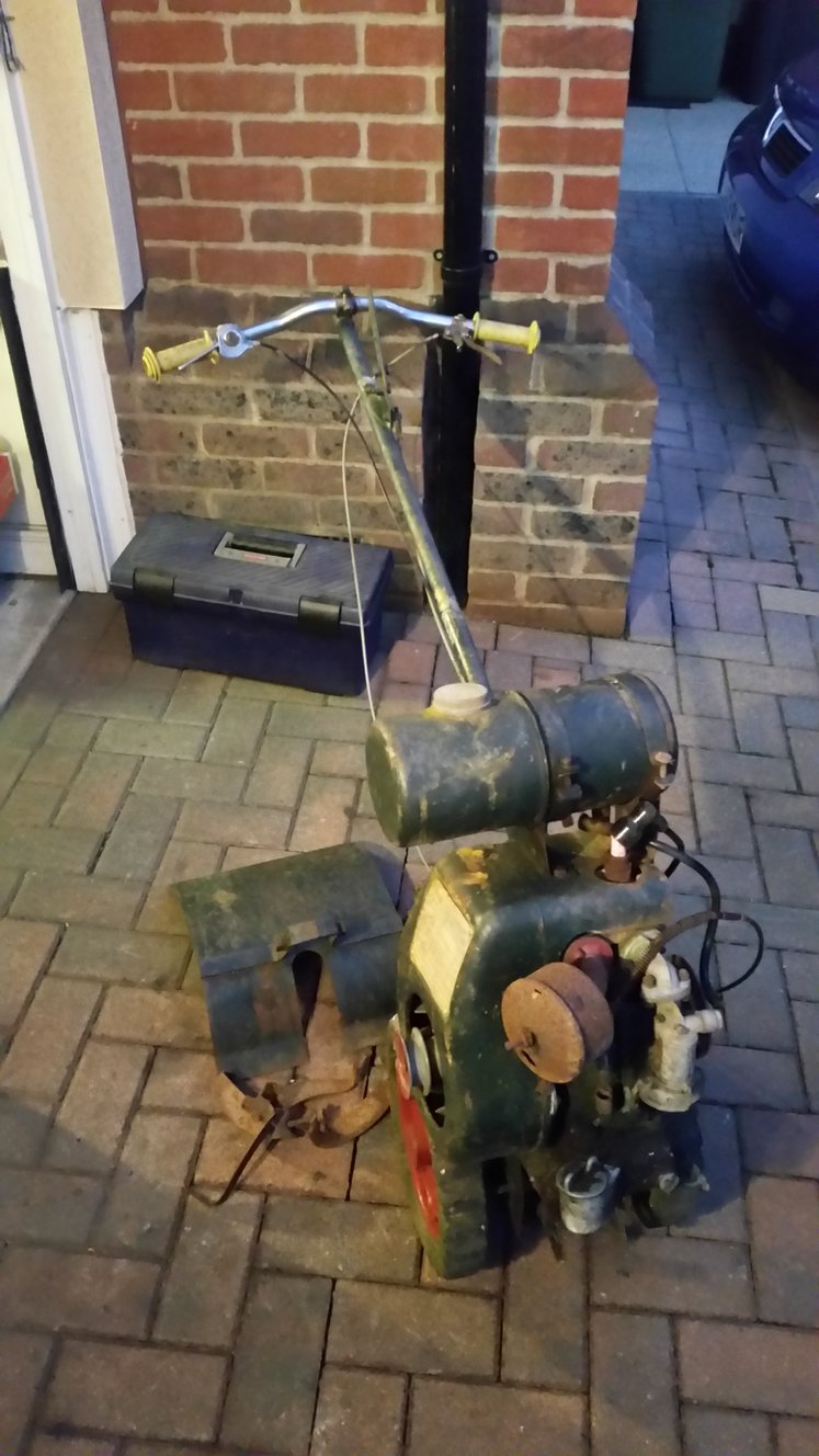 Have just acquired this machine. It will require some work to get it back to, A original, and B working! I was informed that it last ran about a year, 2 years ago? A previous owner had replaced the either missing or broken handlebars with something borrowed from a child’s bike??? The engine turns but has low compression. The B10/1 carb is broken where the air filter clips on. S1G, Gareth has already offered a replacement for that. All the cables are seized or broken. Belts are missing, as is a complete set of blades from one side. The good news is the tin work is solid, rotor cover is only surface rust, the gearbox turns freely as do the rotor shafts.