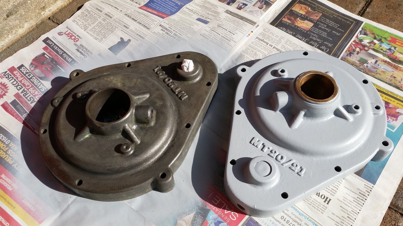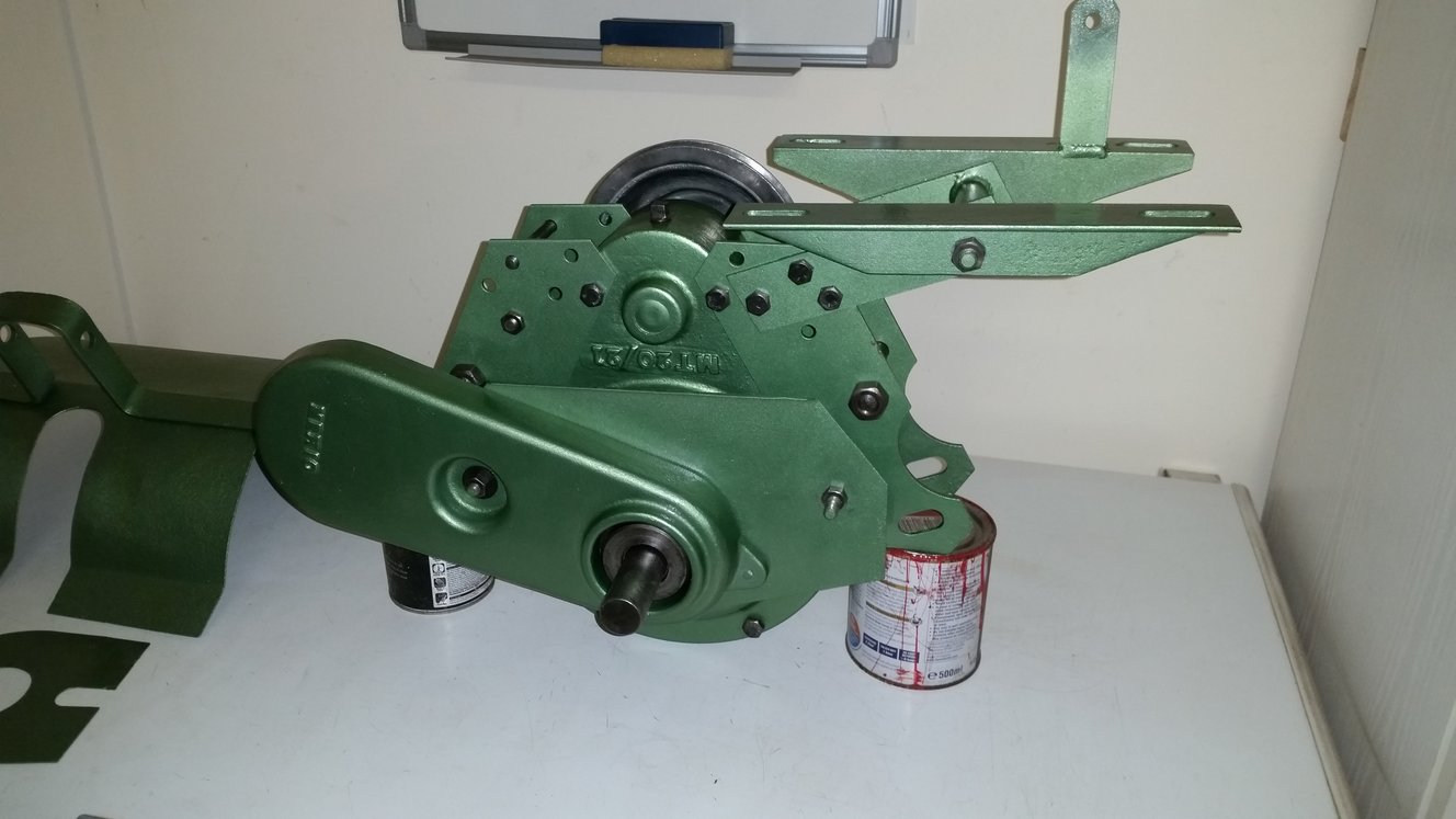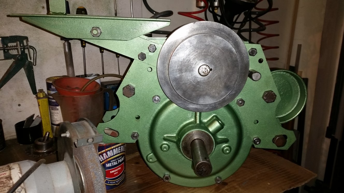 darmic1ParticipantOnce the gearbox was cleaned of all the dried mud and oil, I discovered the actual flat colour I was using was wrong. So a trip to my paint suppliers with a sample to obtain the right metallic colour. Of course this meant taking the engine back to where it could be ‘scotch clothed’ back to key the surface for a re-spray. Here is the gearbox case with the original metallic green found, and the engine following the re-spray.